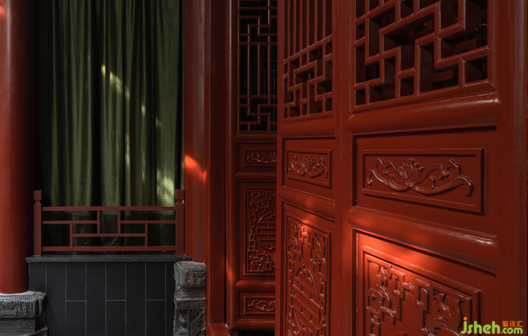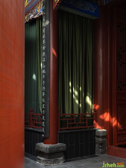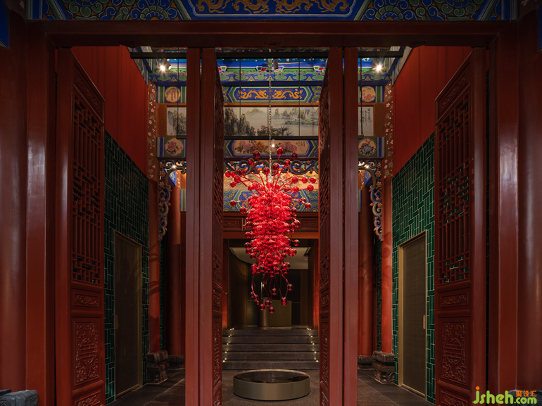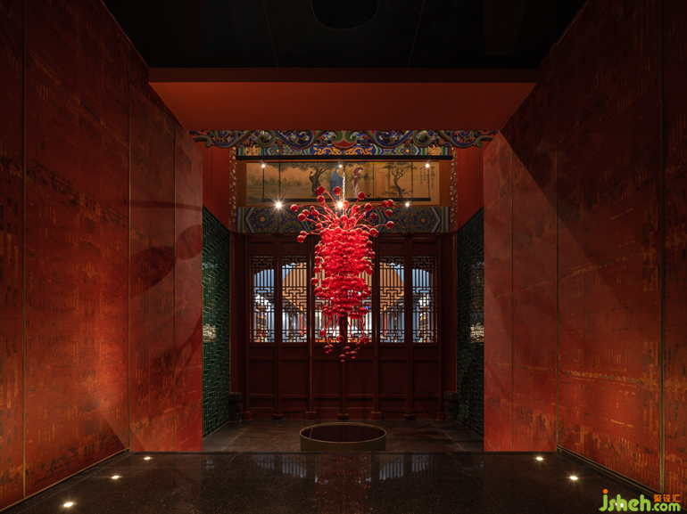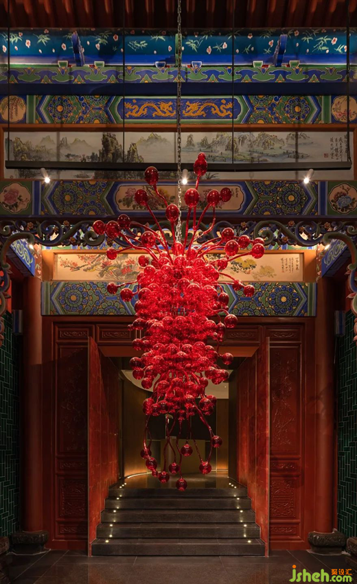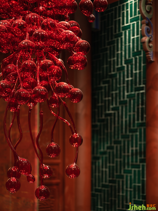 在一層的公共區(qū)域的設(shè)計(jì)中,設(shè)計(jì)師以一種絕妙的力量,來(lái)描繪出熱烈、優(yōu)雅、濃郁的情感。紅彤色琉璃吊燈散發(fā)出布滿了整個(gè)空間的魅力,壓抑的歷史感瞬間被喚醒、被點(diǎn)亮。