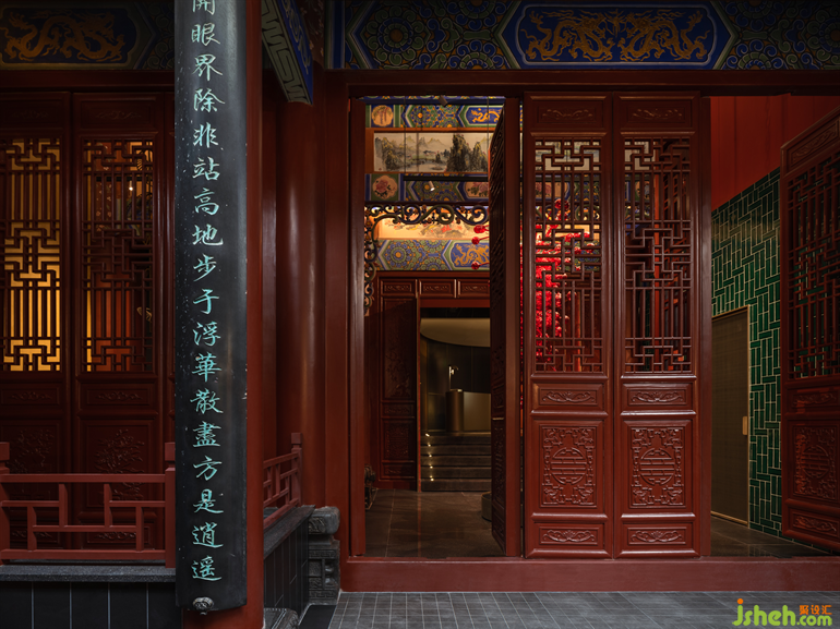 朱漆窗牖、墨綠紗帳、青磚黛石,無(wú)一不體現(xiàn)了建筑中雍容、古典的一面。在唐代的遺文中,強(qiáng)烈的對(duì)比色喚起了繁榮和自信、包容及熱烈。火鍋店設(shè)計(jì)屋檐下勾勒的彩色紋飾,隱約透出精致奢華的質(zhì)感。
