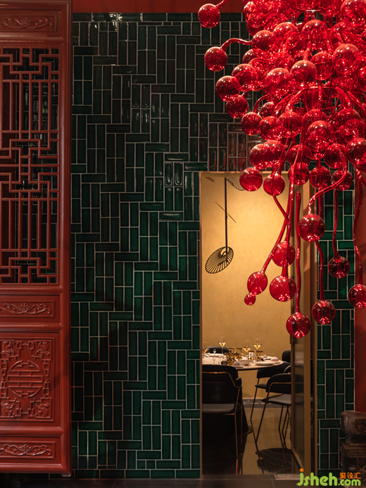如果說(shuō)紅色一直是東方文化中不可回避的話題,那么如雕塑般的吊燈則成為了題眼,它不局限于歷史的文化符號(hào),超越了傳統(tǒng)視覺(jué)的本質(zhì),火鍋店設(shè)計(jì)重新詮釋了當(dāng)代生活中光明、詩(shī)意、自然的一面。墨綠色瓷磚的立面與枝形吊燈形成了相互關(guān)聯(lián)又相互對(duì)立的視覺(jué)聯(lián)系。