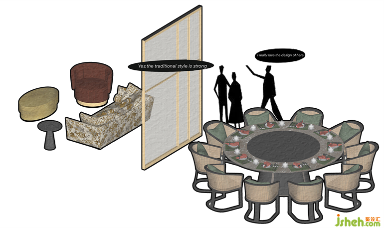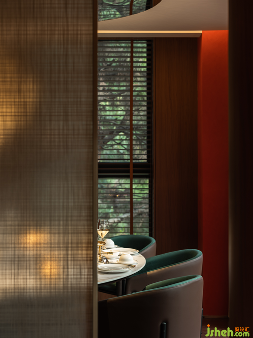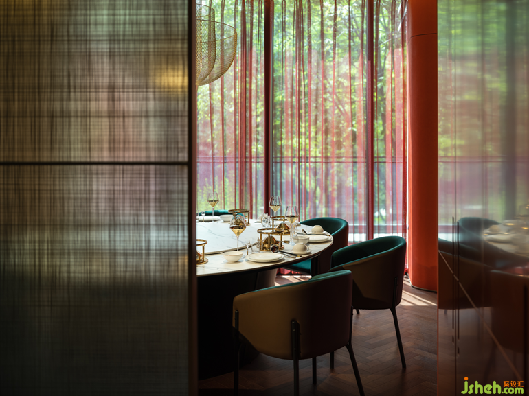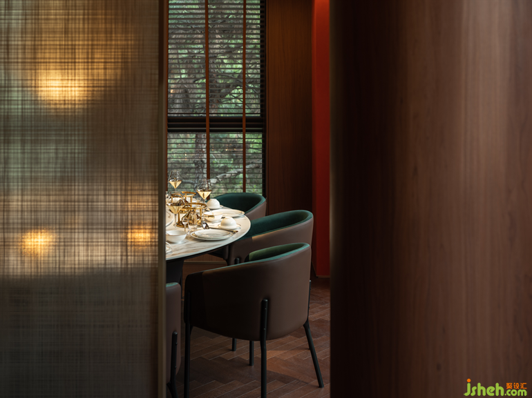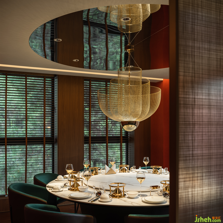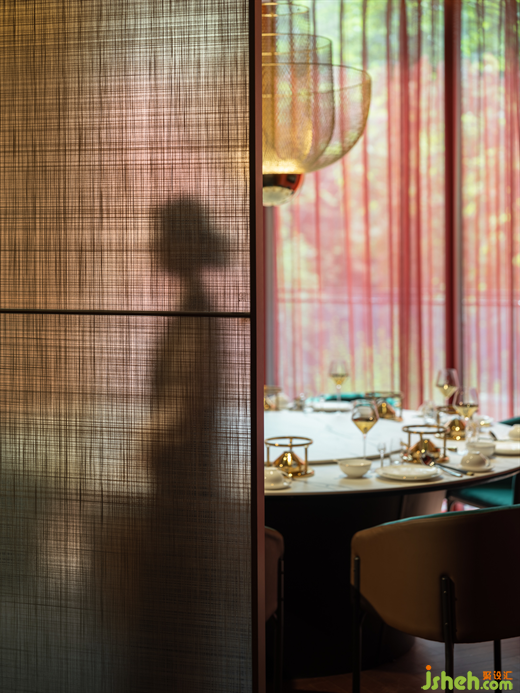 包廂延續(xù)了新古典浪漫主義,厚重的隔斷與紗帳,帶來夢里看花的朦朧美感?;疱伒暝O計師以材料、色彩、器物、藝術(shù)等諸多方面入手,為現(xiàn)場營造出精致、優(yōu)雅、奢華的氛圍感。