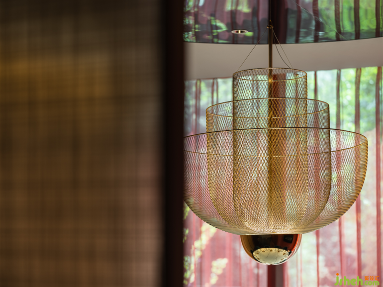 金屬絲網(wǎng)薄而柔韌,不同尺寸的圓柱型網(wǎng)格帶來精致的古典意味。枝形吊燈游走在確定與不確定的邊界之間,從規(guī)則、秩序和變化中產(chǎn)生獨特的美,同時被交織的網(wǎng)格籠罩在夢幻之中。