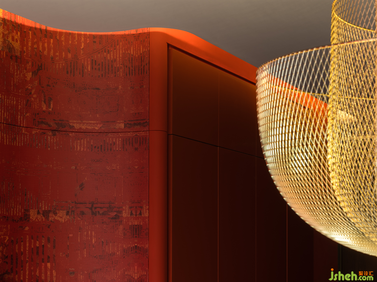 與弧形墻面相呼應著的金色網(wǎng)格的吊燈,成為了空間視覺的焦點。火鍋店設計師將一種最基礎的材料——黃銅,轉(zhuǎn)變?yōu)橐环N工業(yè)詩意的美學。他摒棄了黃銅的笨重、陳舊和剛強,展現(xiàn)出它輕盈、柔韌和古典的一面,以此與紗帳相呼應,空間透過它的紋理和無數(shù)細密的網(wǎng)格交織、靈動起來。