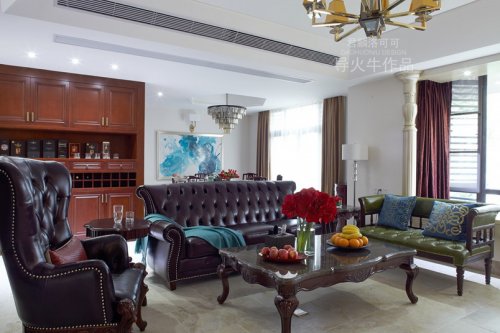 客廳的三人沙發(fā)不能拆洗的部分(主體框架)全用皮料制作,布料則用于可拆洗的部分(坐墊和靠墊),顏色和海錦重新挑選,從視覺上減輕大塊頭的重量感。