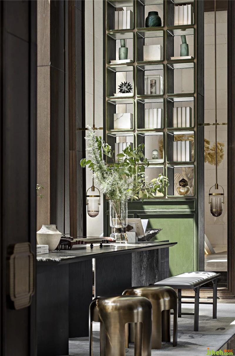 書香之中,細節(jié)處處可窺。精美的收藏品與書融為一體置于祖母綠通柜,落座處就能看見盆景和山石,自然與文化緊密相連,每一個角度都能成為一幅空間畫卷。