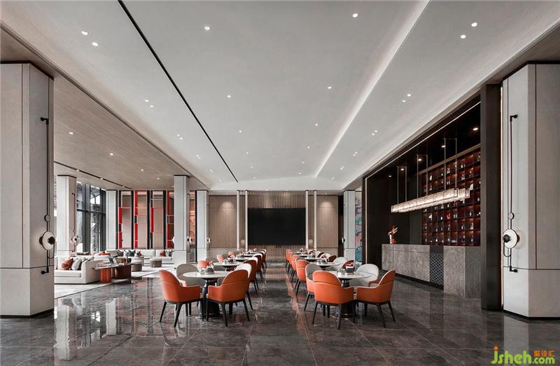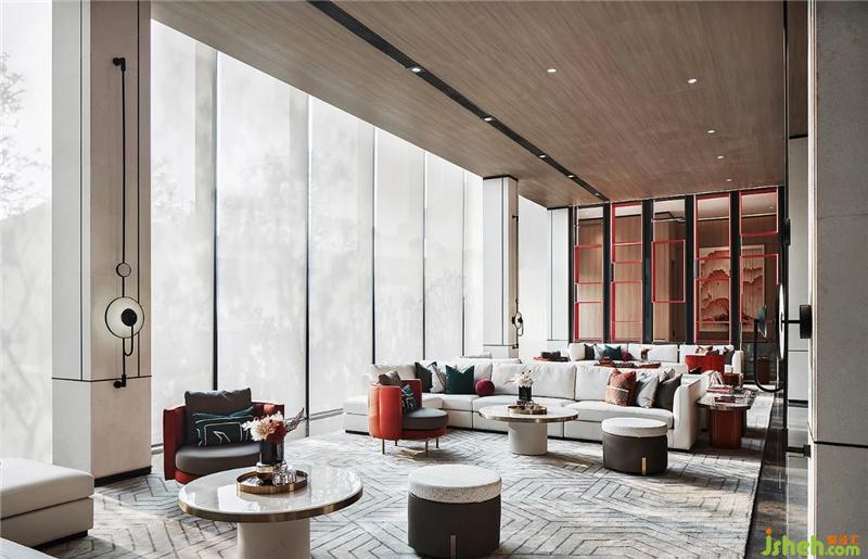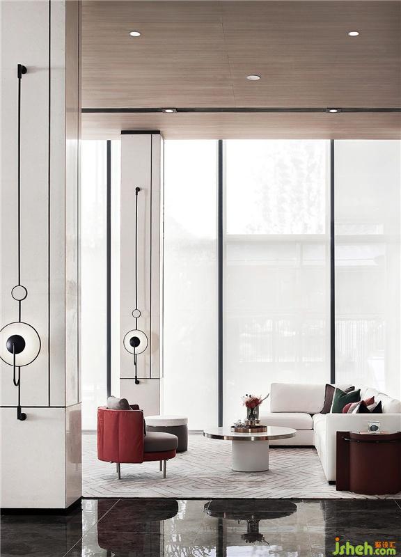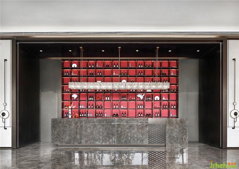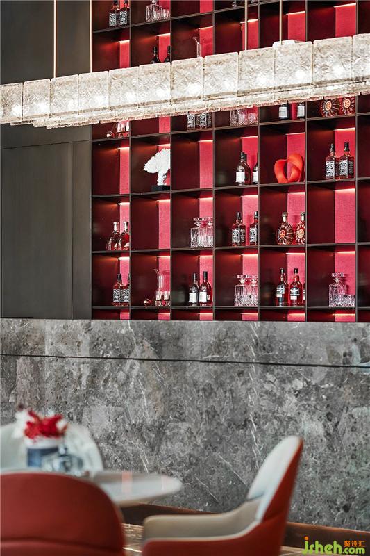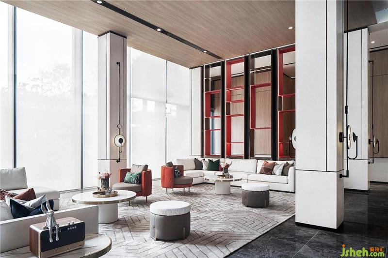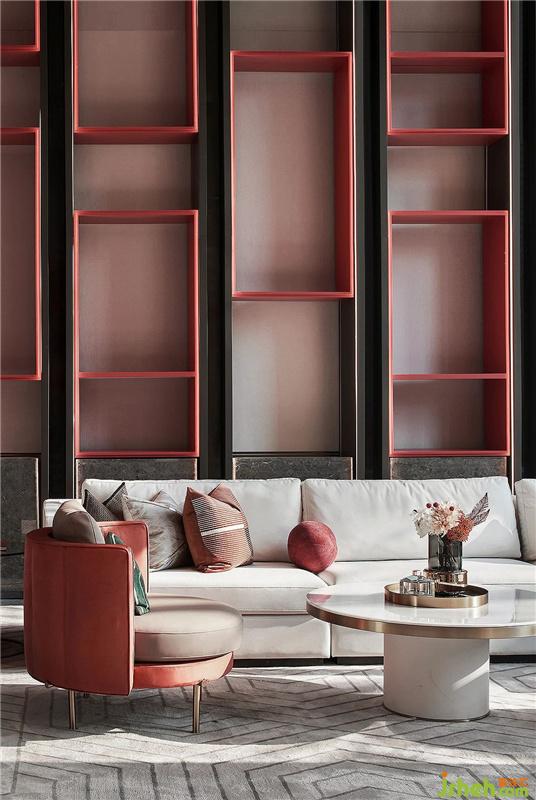 水吧臺(tái)背景墻以紅色呼應(yīng)空間顏色,建筑瓦礫細(xì)節(jié)藏于吧臺(tái)間。營(yíng)銷中心設(shè)計(jì)將水元素、魚燈和建筑特色伏線于細(xì)節(jié)中,節(jié)奏干凈到位,層層遞進(jìn),用空間來設(shè)計(jì)、引導(dǎo)風(fēng)雅生活的當(dāng)代回歸。