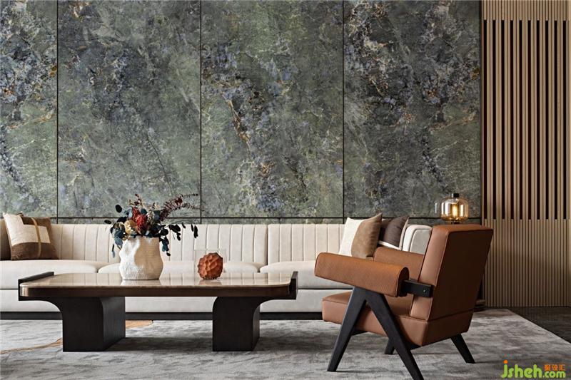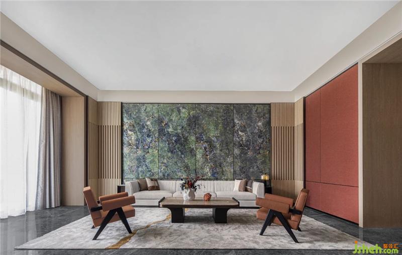 在通透開(kāi)闊的尺度中,溫潤(rùn)的木作、大面積蔥蘢的綠意背景石墻,以其輕巧靈動(dòng)的落座形式,共同承載起情感氛圍的營(yíng)造。面料、木藝、金屬及石材等不同材料之間的碰撞,簡(jiǎn)明而克制,材質(zhì)的肌理與禪意完美融合。
