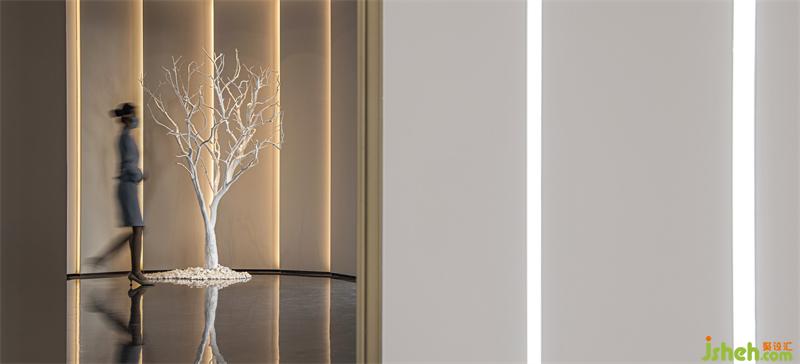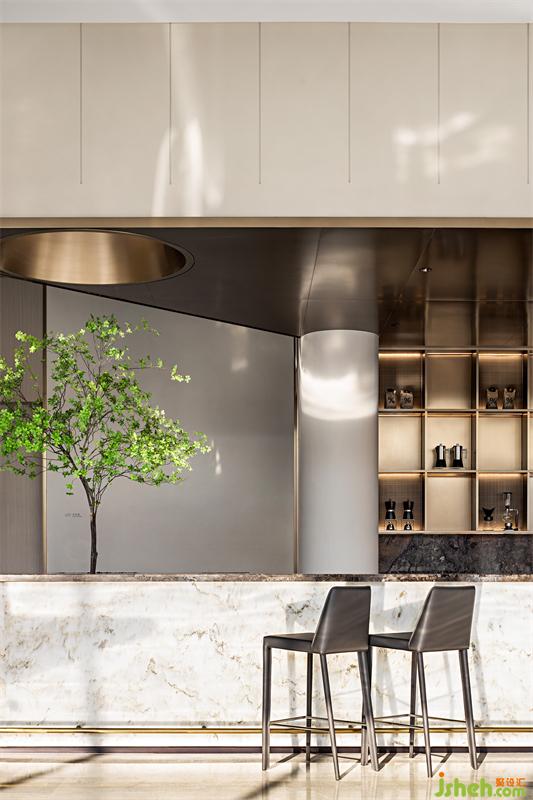 金屬的冷冽與華貴,通過現代裝飾語言的轉化,回應了空間應有的厚度與質感,與一旁的玻璃幕墻對望映襯,一面清緩、一面醇厚,顯露出和諧的自在狀態(tài)。