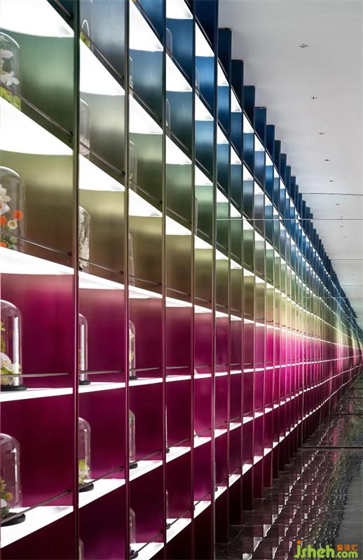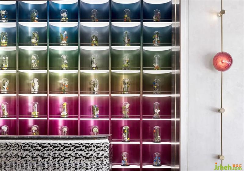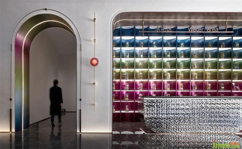 水吧區(qū)墻面藝術(shù)的泡泡花藝裝置,在藍(lán)、紅色彩的基礎(chǔ)上與空間中多彩的不銹鋼保持統(tǒng)一的色系呼應(yīng),售樓處設(shè)計(jì)猶如星際里的太空實(shí)驗(yàn)裝置,感知探索生命與科技空間,在視覺藝術(shù)上與空間故事共鳴。