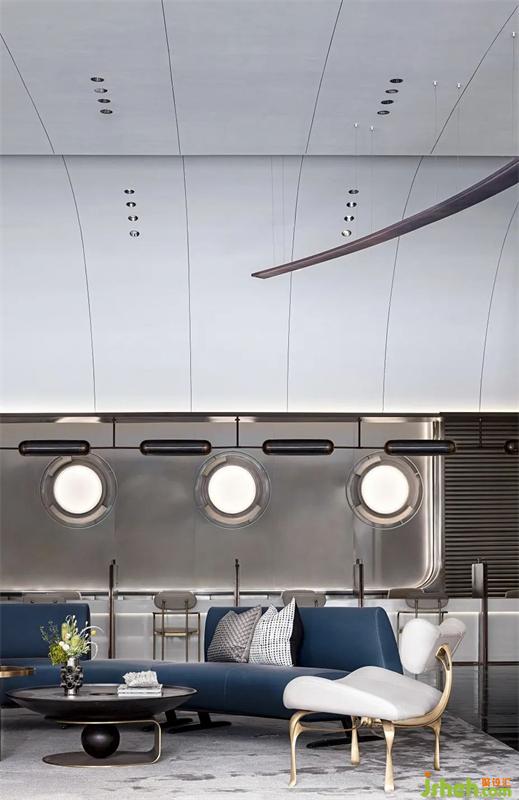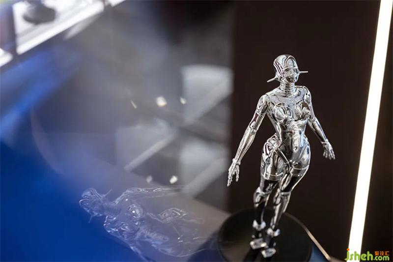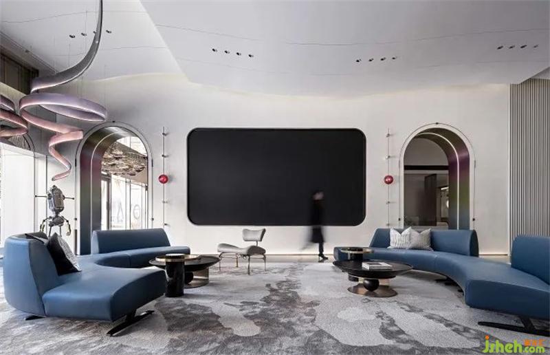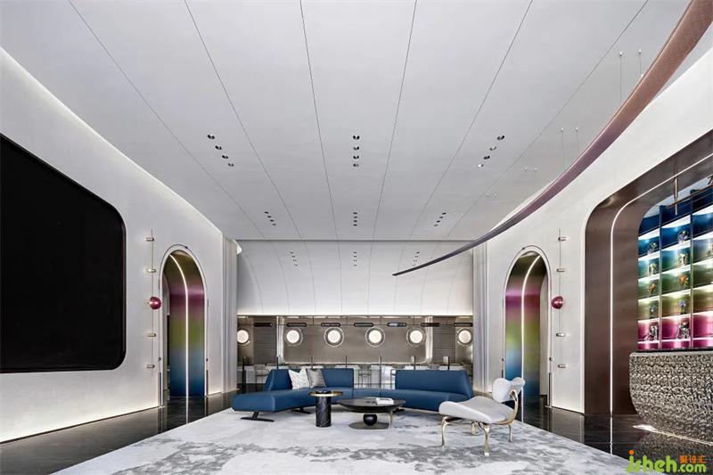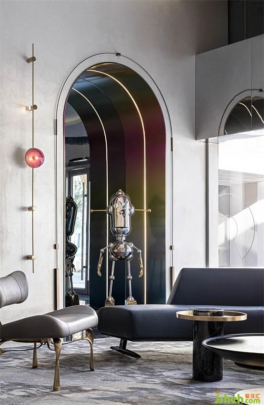 在洽談區(qū),角落的機(jī)器人頭頂上抽展出一條漫漫的金屬彩帶拓展視覺延續(xù)性,售樓處設(shè)計(jì)營造張力的動態(tài)感空間,虹彩礦物之美與現(xiàn)代建筑在非敘事系列中相互發(fā)現(xiàn);見證了光的旅程,整個(gè)空間在硬裝動感的線條襯托下,給人自由的時(shí)空感。