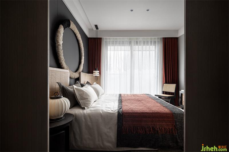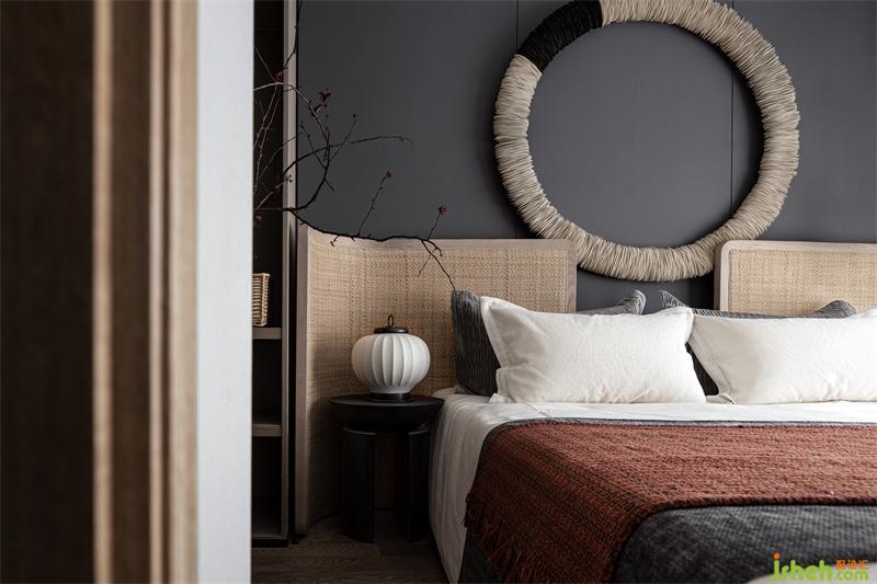 穿過樓梯,來到二樓,臥室的設(shè)計(jì)以高級(jí)、柔軟為基調(diào),大體量的藤質(zhì)用材,樣板房設(shè)計(jì)以其本真之態(tài),泛起淡淡的恬靜與溫存,給予臥室空間富有質(zhì)感的底色。暗紅窗簾點(diǎn)綴了空間的色彩生機(jī),讓質(zhì)樸的灰色俏皮靈動(dòng)了起來,在提升空間隔光效果的同時(shí),又營造出了沉穩(wěn)之感。
