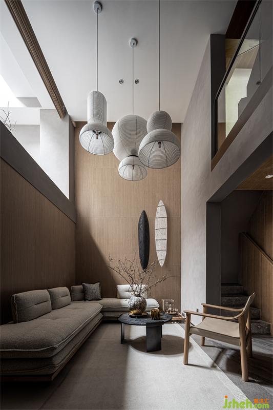 行至負(fù)一層,來到主人家的會(huì)客區(qū)域。業(yè)主在這可以招待朋友,相談甚歡,亦可在此處愉悅自己的生活,享受自己的獨(dú)處空間。樣板房設(shè)計(jì)師賦予空間不同功能的可能性,避免單一功能空間的重合浪費(fèi),也是現(xiàn)代精神的提煉與表達(dá),同時(shí)體現(xiàn)了主人家的優(yōu)雅、愜意的生活態(tài)度。