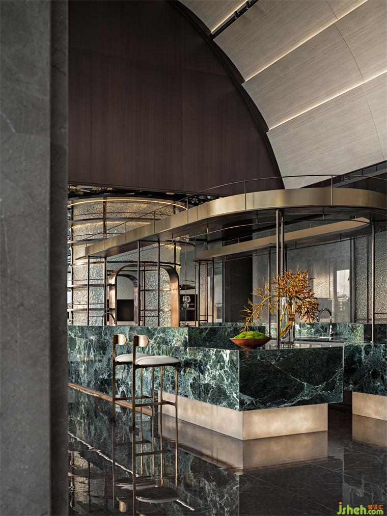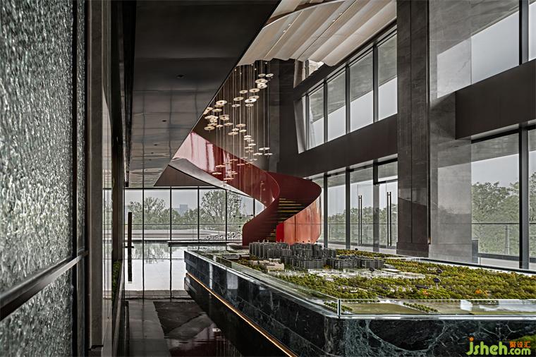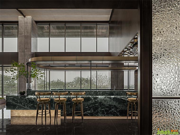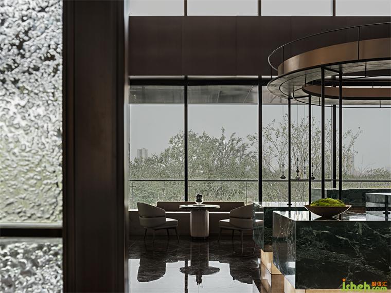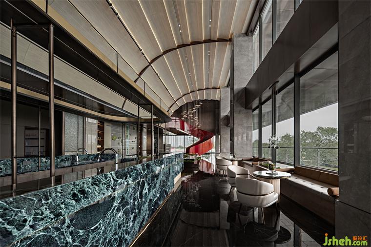 設(shè)計(jì)師在空間視覺的描繪上,往往是感性填充的,在這里,我們通過(guò)仿似拱形船艙的入口,看到波光粼粼的天空,這與真實(shí)的場(chǎng)景視乎有所偏離,這種江與天之間模糊的錯(cuò)位的形象替換,正是設(shè)計(jì)師所思考的空間的詩(shī)性——秋水共長(zhǎng)天一色之境。