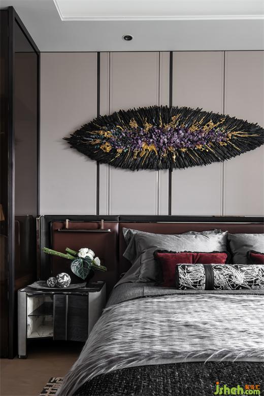 淺米色的背景墻與深棕色的皮革床靠搭配,樣板房設(shè)計散發(fā)出成熟的韻味,凝練的軟裝組合勾勒了主臥的雅奢質(zhì)感。