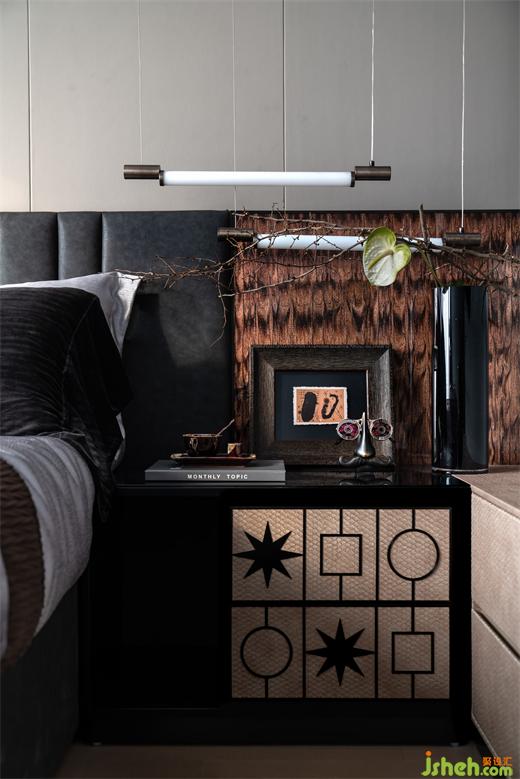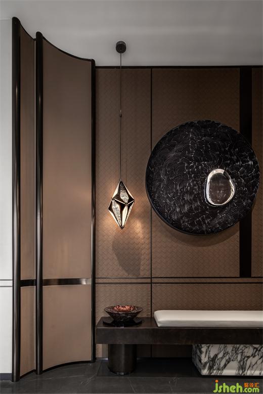 入口玄關(guān)處,BVLGARI的寶珠系列結(jié)合扇形暗紋金屬與經(jīng)典六邊形蛇紋雕刻,樣板房設(shè)計充滿浪漫氣息,恰到好處的體現(xiàn)高雅氣質(zhì)。