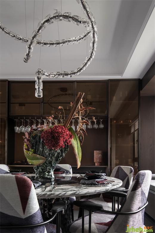 餐廳吊燈形似靈蛇圖騰,以迷人的姿態(tài)象征永生,樣板房設(shè)計呈現(xiàn)獨有的蔓延彎曲,誘惑且感性。具有意式風(fēng)情的皮革色彩和紋路質(zhì)感,每一個用材和細(xì)節(jié)都詮釋了尊貴和獨享。