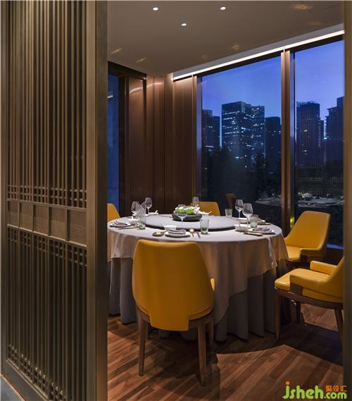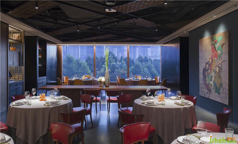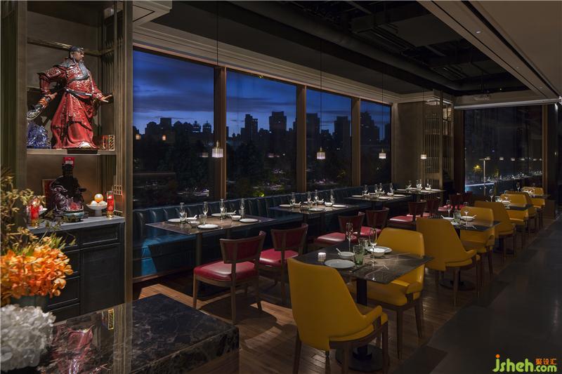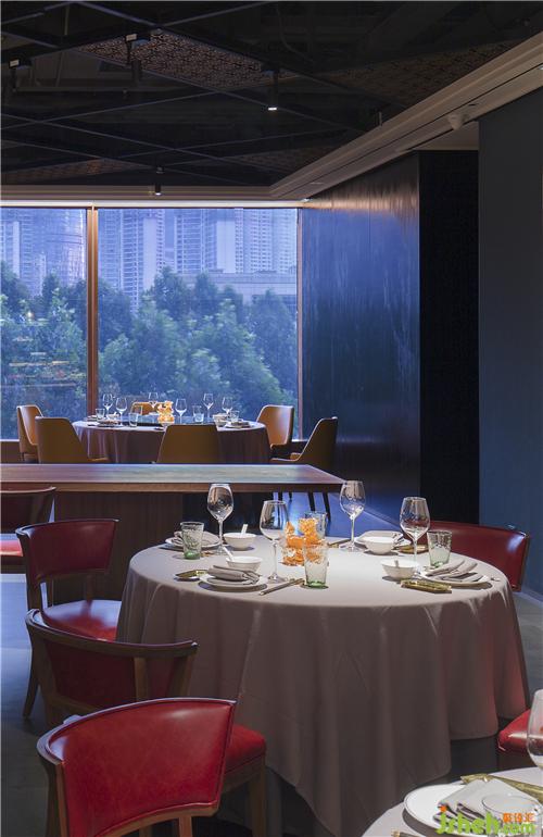 運(yùn)用山水畫中的平遠(yuǎn)觀法,使長條落地窗正好引入江景,橫向排布的餐桌為第一層、窗外樹木為中間層上海餐廳設(shè)計(jì)、CBD高樓為外層,層層推遠(yuǎn),模糊了空間的界面,擴(kuò)寬了視野。