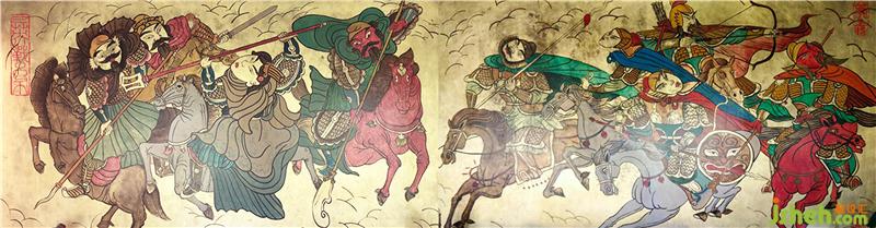 大廳內(nèi)的壁畫是整個(gè)場(chǎng)所色調(diào)的靈感之眼,點(diǎn)睛之筆。藝術(shù)家將傳統(tǒng)的三國故事中兩大高潮——三英戰(zhàn)呂布和五虎上將重新繪制,既保留民俗畫的質(zhì)樸率真,又體現(xiàn)國士之風(fēng)兄弟情義以延續(xù)空間情感。設(shè)計(jì)師則從中提取五行設(shè)色,將這些情感色彩語言應(yīng)用到空間里。室內(nèi)每一張餐桌擺放著代表新榮記標(biāo)志的琉璃麒麟擺件,為餐廳增添了幾分趣味。
