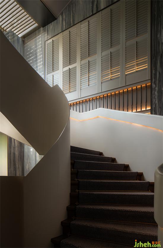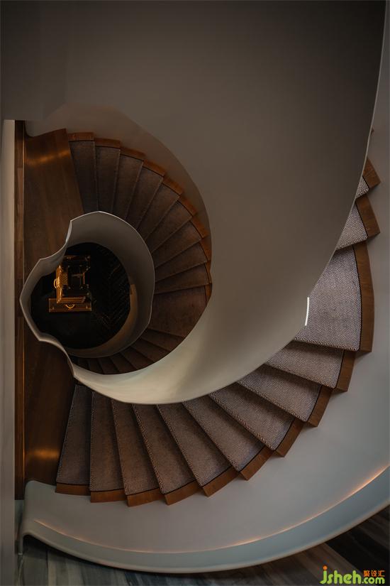 貫穿三層的旋轉(zhuǎn)樓梯作為視覺中心,是整篇“故事”的文心。只見它螺旋狀向上升騰,配合頂部光線,完成引導(dǎo)的餐廳設(shè)計(jì)功能。