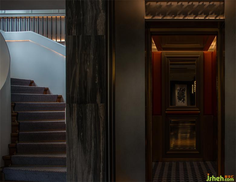 二層采用劈視兩看的蒙太奇手法,左側(cè)是傳統(tǒng)樓梯,右側(cè)是現(xiàn)代電梯,時(shí)光仿佛在此停駐,紅白灰的鮮明對比,為空間賦予了新的生命力。