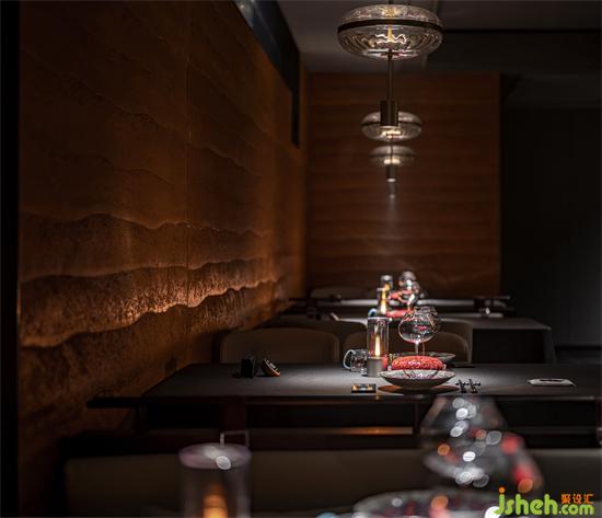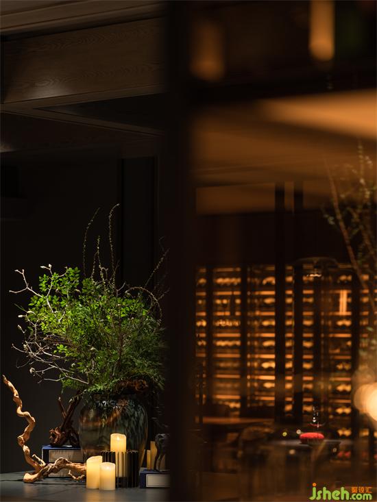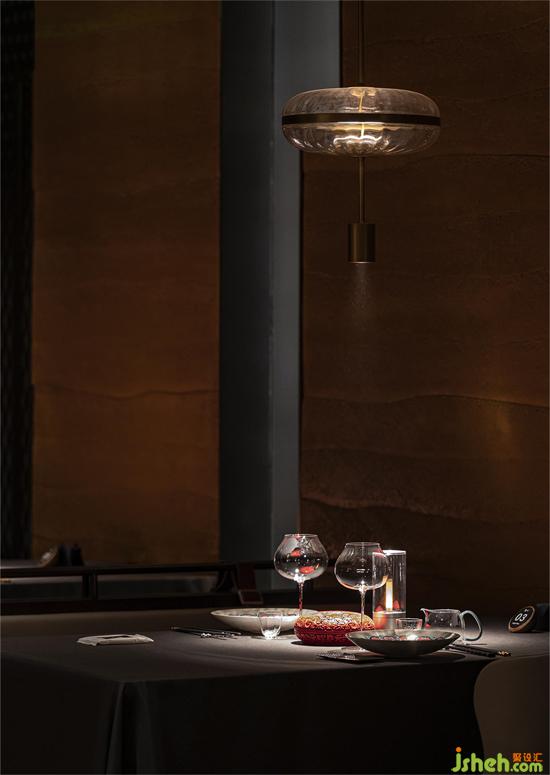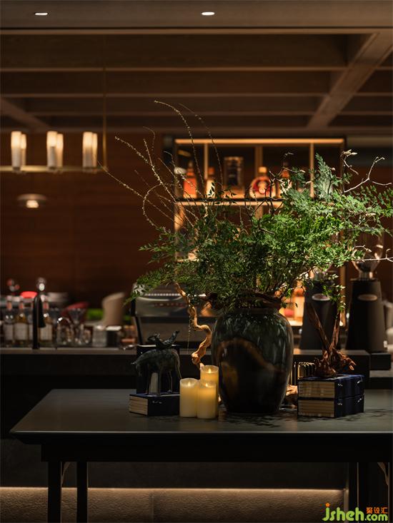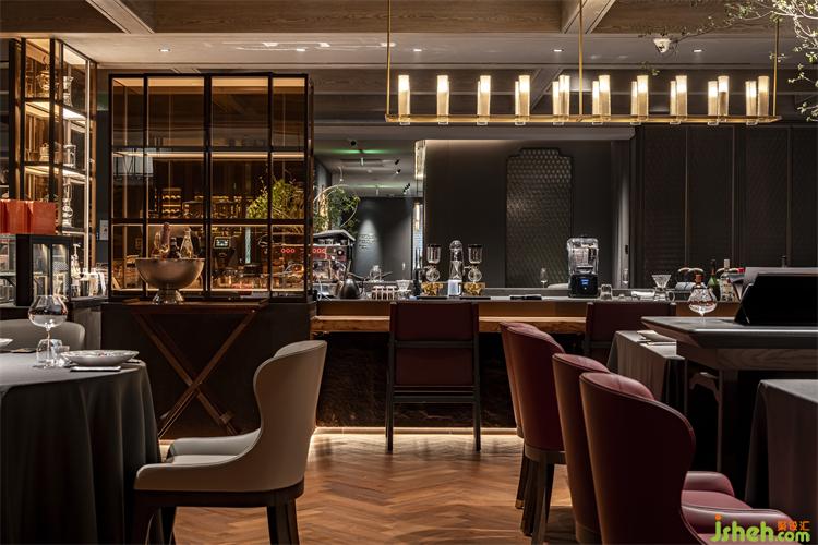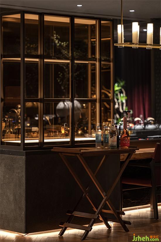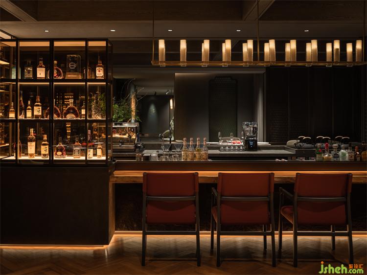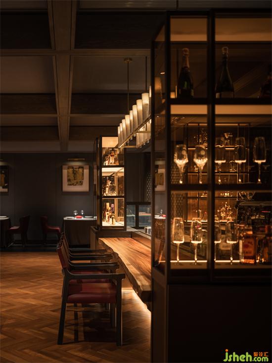暖光渲染柜中美酒,陣列式燭臺懸掛操作臺上方,視線穿透咖啡吧望見遠處長廊,隨步調(diào)轉(zhuǎn)折,飲茶空間被徐徐展開。