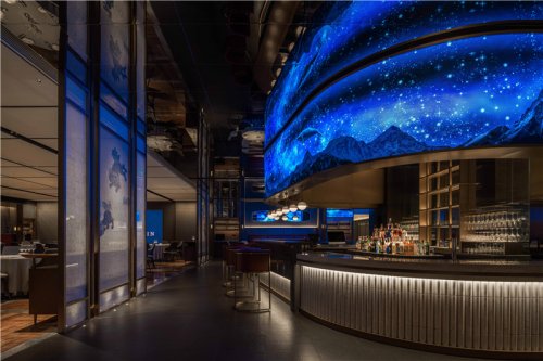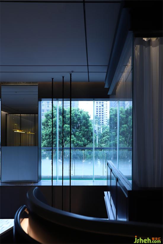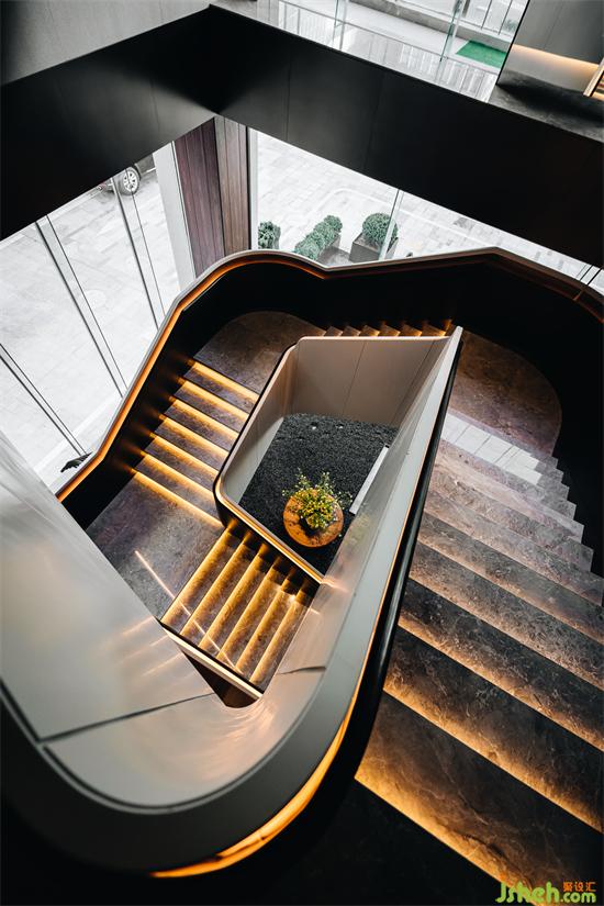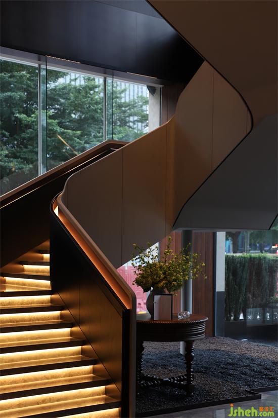 迎賓入門,光影變幻,右側(cè)樓梯,盤旋而上,玻璃環(huán)伺,給人第一時(shí)間的視覺沖擊,柔和橙光伴隨大理石臺階鋪陳而下。