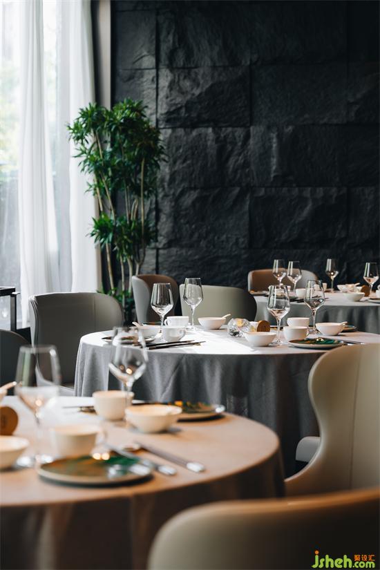 圓桌零點區(qū)和卡座沙發(fā)區(qū),徐記海鮮餐廳設計充分利用半開放式的用餐形式。淺色定制餐椅組合、卡座沙發(fā)與深色石材墻形成明暗對比。