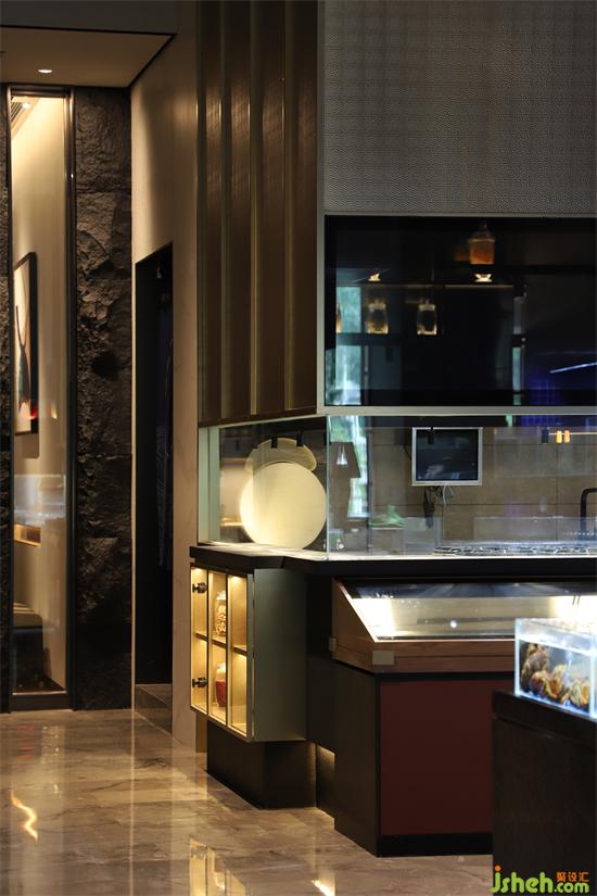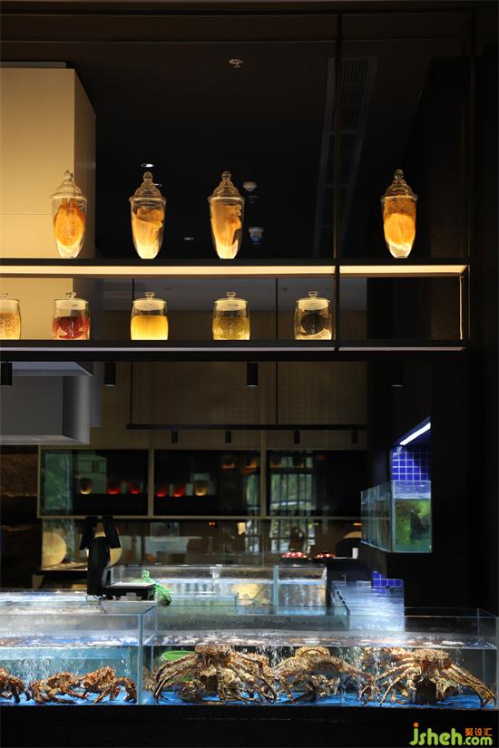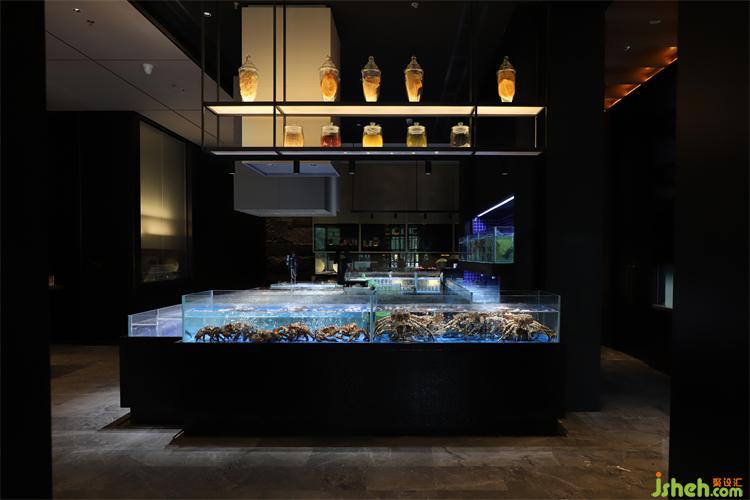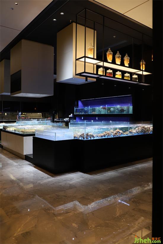 海鮮島上方天花在色彩上與周邊形成視線差,黑色基底營造深淵感,設(shè)備體塊從頂部錯(cuò)落倒掛,徐記海鮮餐廳設(shè)計(jì)光線集中于吊架與海鮮池,目光由此聚焦。
