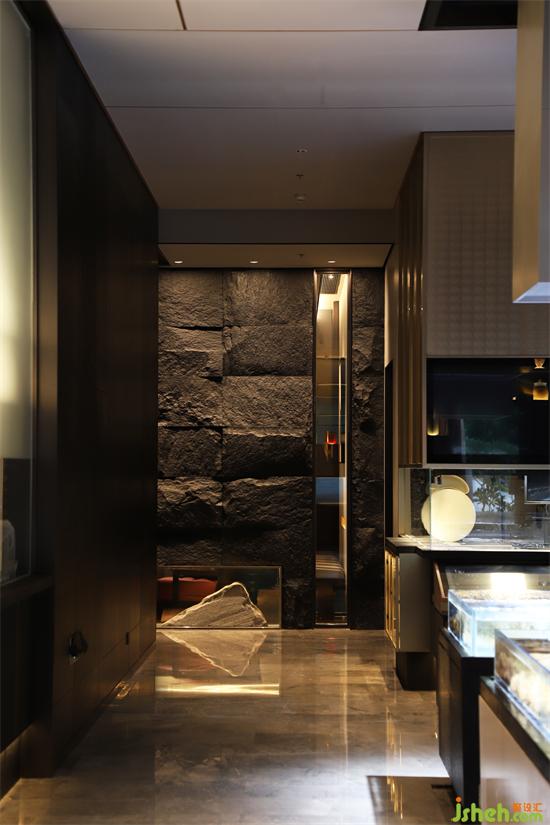 穿行過道,盡頭處“過海見山”呈現(xiàn)本案山海徐來的理念,徐記海鮮餐廳設(shè)計(jì)師選一角頁巖擺件,置入透明塑料保護(hù)罩中,搭配反光的地面和頂部射燈形成“山巒與它的倒影”。