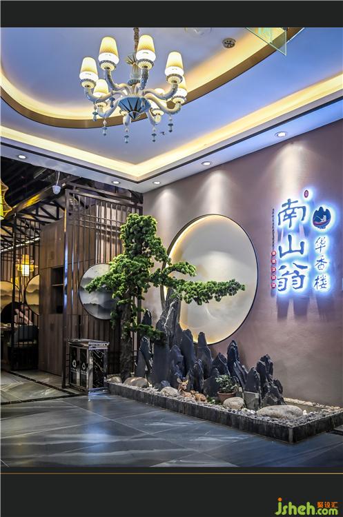 進(jìn)門處古松與奇石相映成趣,一輪圓月與秀美山色交相輝映,美輪美奐,讓人心曠神怡,食客在進(jìn)入餐廳之前,就能感受到南山翁希望傳達(dá)的“金樽一舉明月落”的古典曠達(dá)與詩(shī)意。