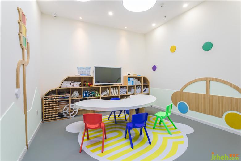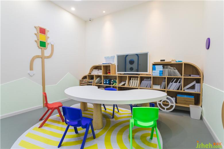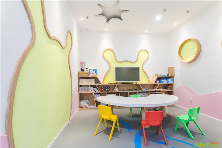 門下來,是一個智力游戲臺,同樣被具有科技感的腦回路吊頂所映襯,寓意智慧在此綻放異彩。游戲臺旁側(cè),便是老師與家長交流的席位,布置溫馨而簡潔。