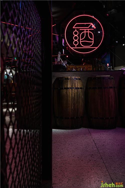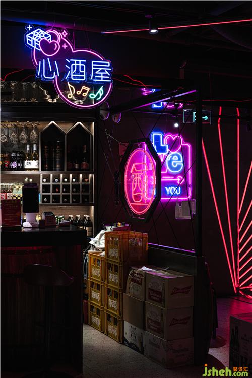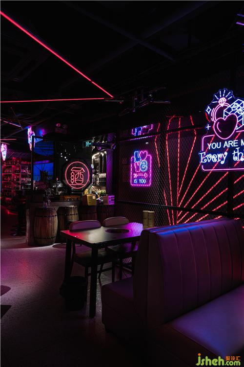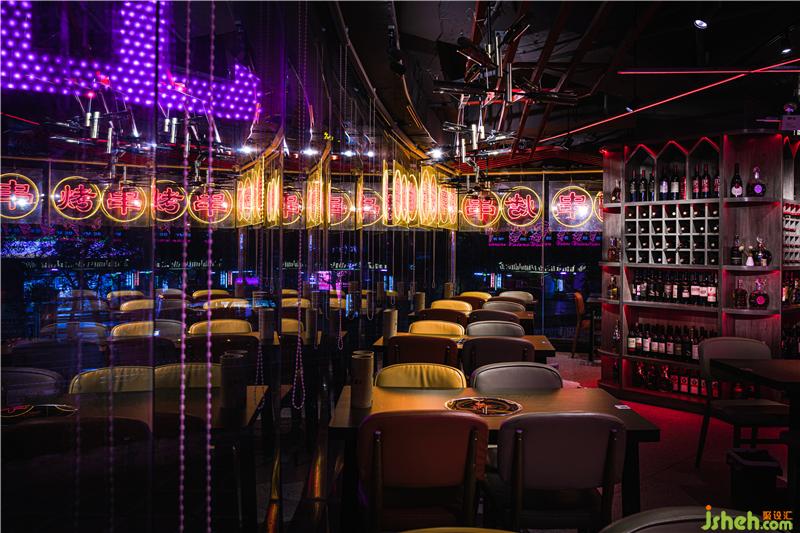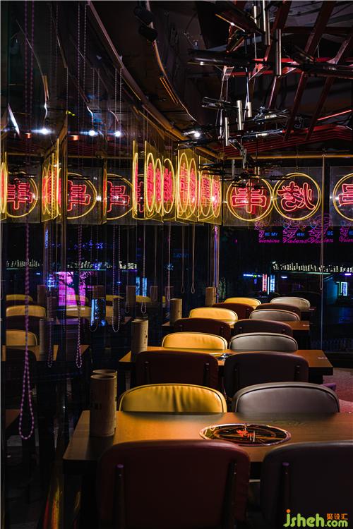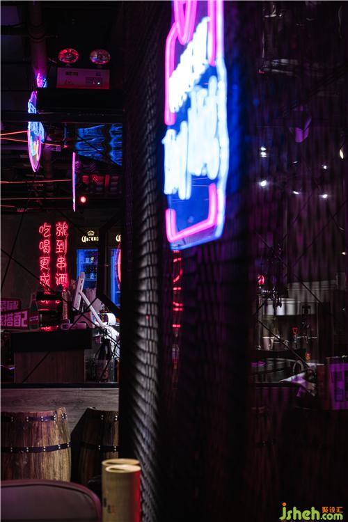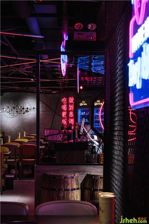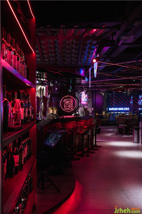 入口處的走廊設計采用發(fā)光色的樓梯,壓低自然光線對室內的影響,燈帶的變換,讓整個大廳充滿著火熱與延伸感。室內的燈光情境更加突出了,使入口空間夢幻且別具一格。店里的燈具主要采用logo的形狀,充滿著音樂酒館的感覺,天花的投影設計也恰到好處,從現(xiàn)場看燈光的投影照射到每一張桌子,層次感極佳,氛圍感也很到位。