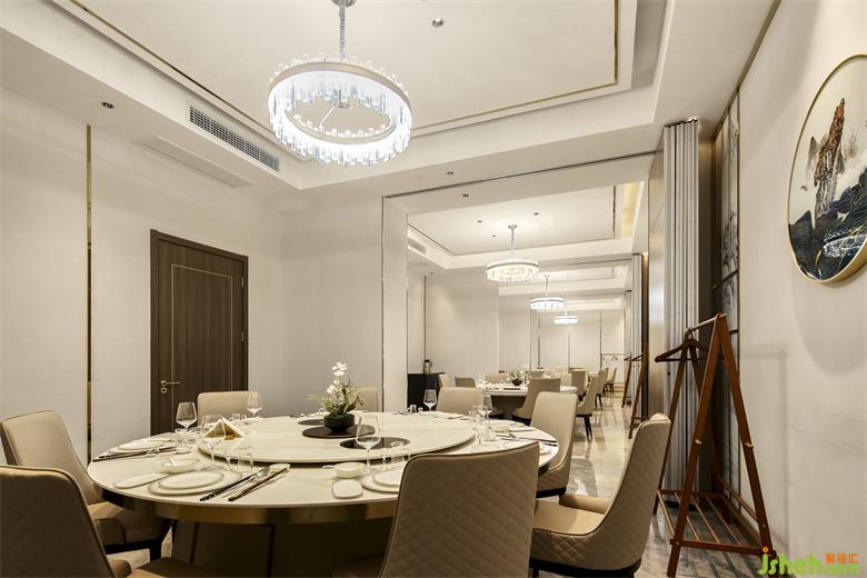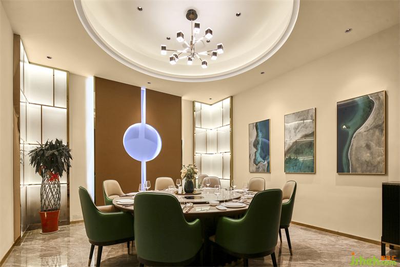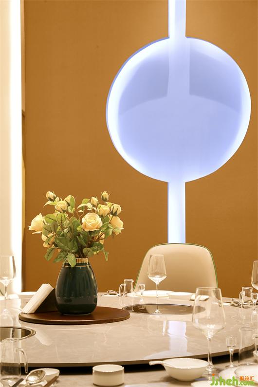 LED顯示屏配合魚(yú)群吊燈,映射在灰白大理石的紋樣上,至真至幻,水波蕩漾。既呼應(yīng)了餐廳的特色,又讓空間飽含深海的環(huán)境元素,視覺(jué)上營(yíng)造出動(dòng)態(tài)、自然的質(zhì)感。