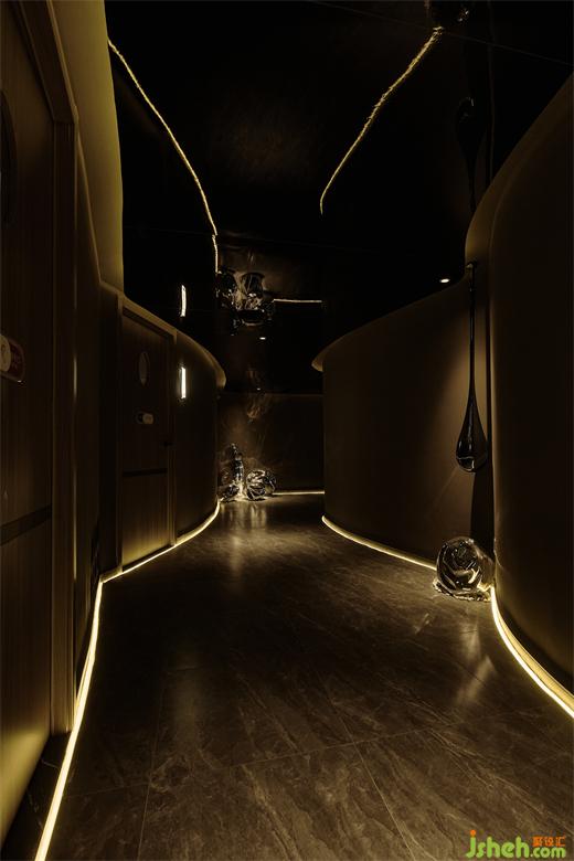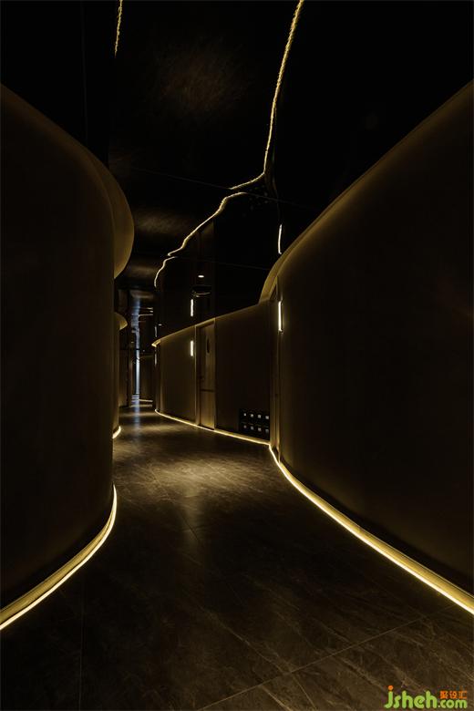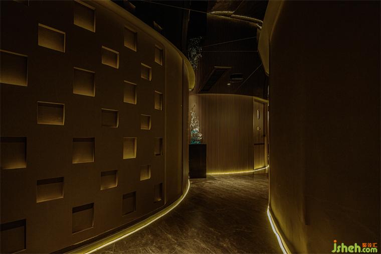 我們?cè)诳臻g中打造出只能看見“光”,卻看不見“燈”的效果。所以不僅僅是燈光設(shè)計(jì),也是明暗的設(shè)計(jì),走在過道上,仿佛置于一個(gè)被海水包圍的輕松感,讓禪意之美與情韻在視線延伸中娓娓道來,步移景異。
