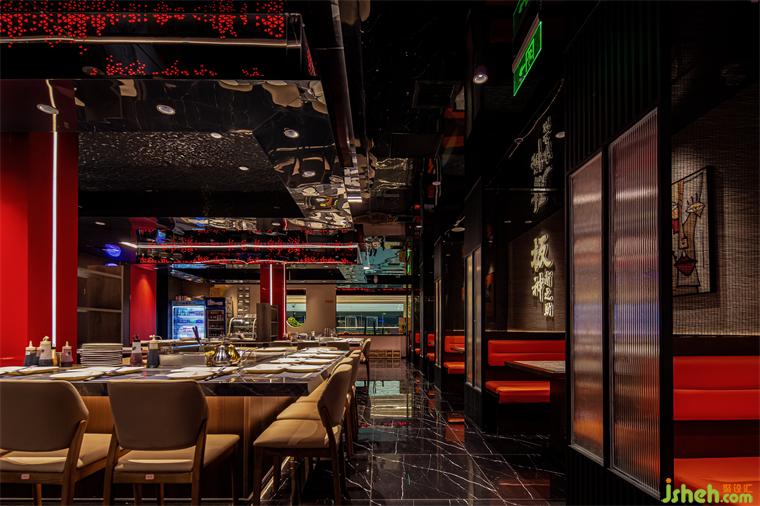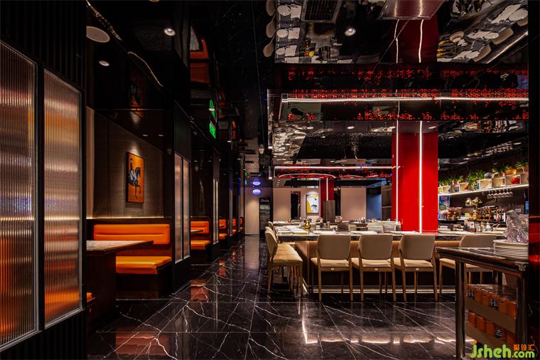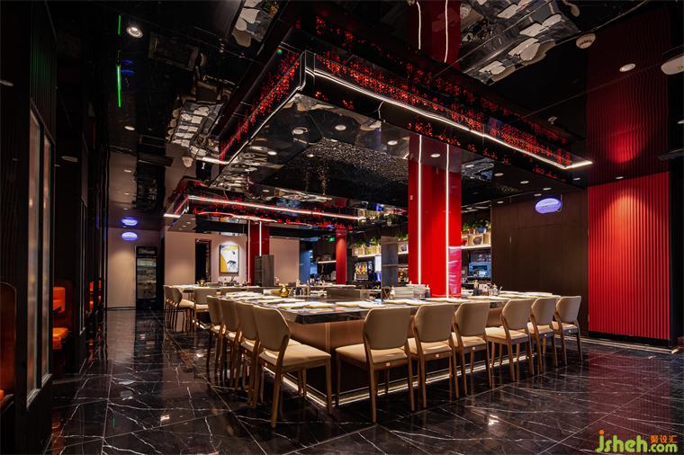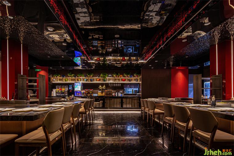 本方整體的硬裝上提取自然的大地色調(diào)為設(shè)計(jì)語言,并結(jié)合屋頂紅色方塊,點(diǎn)亮空間色彩,鐵板燒設(shè)計(jì)多種材質(zhì)運(yùn)用,天然紋路理石、工藝精良的金屬、侘寂自然的材料,意在彰顯空間的流動(dòng)之美。