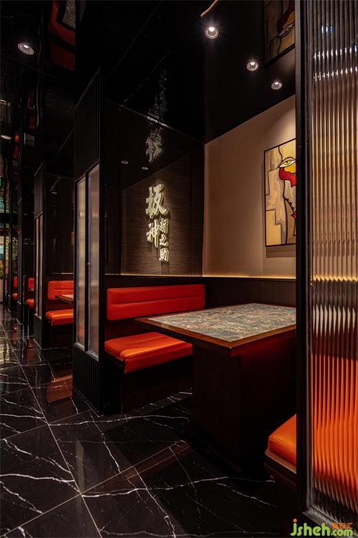 門口升騰火焰的壁爐是點(diǎn)睛之筆,增加用餐氛圍的煙火氣,與橘黃色不規(guī)則的燈光映照下,里面有著無盡的富藏和溫度,與“板神新之助”的logo相呼應(yīng),帶來神秘純粹的意境。