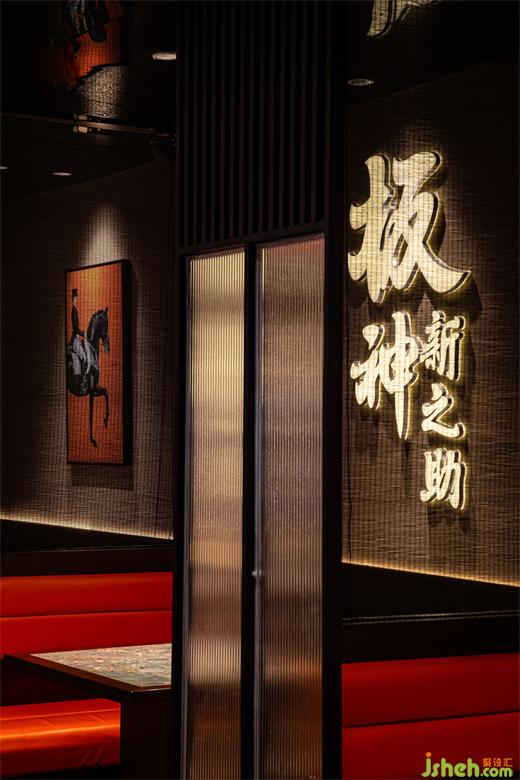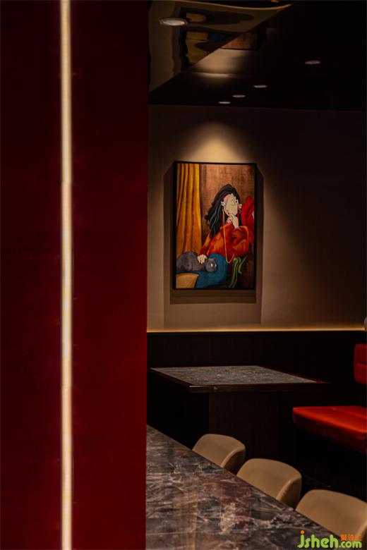 卡座的設置,悄然間打破空間炙熱與升騰的氛圍,在空間色彩中尋找新的平衡美感。就像火焰的余溫一樣,雖然強烈的愛讓生活熾熱,但余生的歲歲年年卻是一日三餐的溫暖。