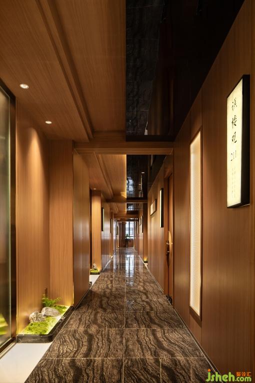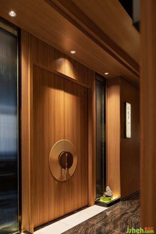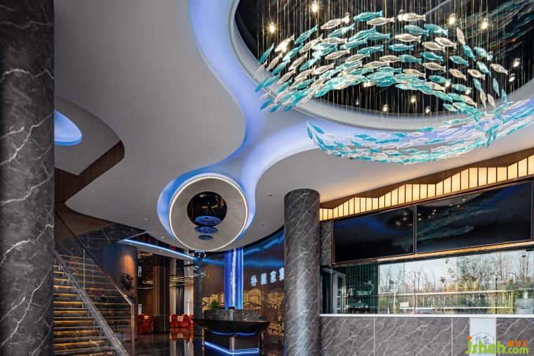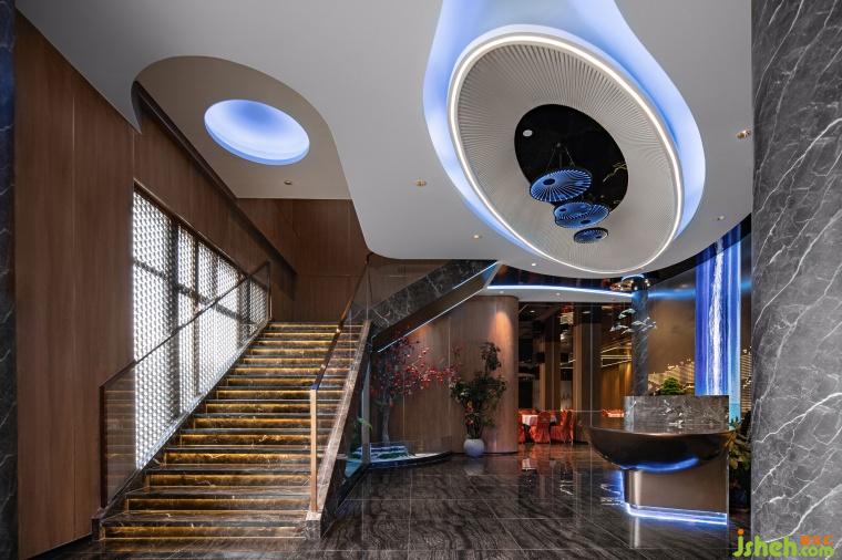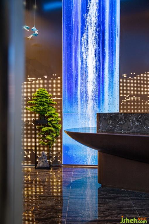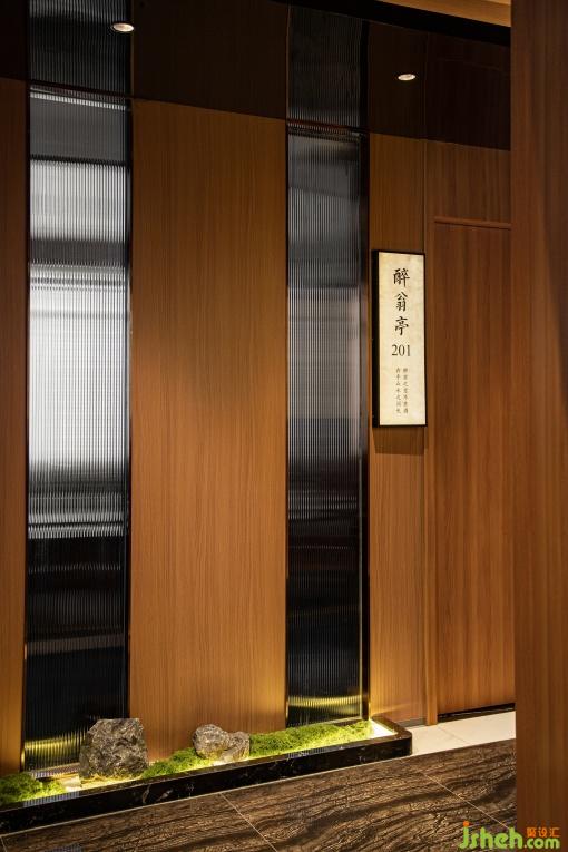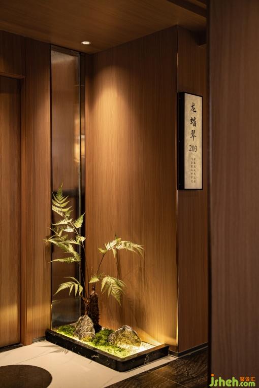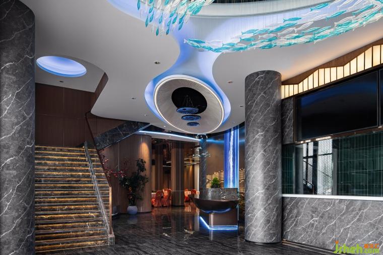大廳的材質(zhì)采用原木與石材結(jié)合,仿佛踏入瑯琊山的山徑。頂面的燈具模擬出了山泉水面的漣漪與游動(dòng)的魚群,生動(dòng)描繪出了讓泉的景色。大廳各處點(diǎn)綴了綠植與水景,營(yíng)造了自然的氛圍。