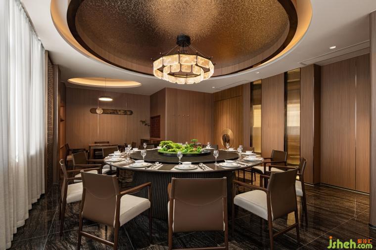 上方的水波紋吊頂,恰似讓泉水面粼粼的波光。形態(tài)各異的燈具設(shè)計(jì),通透的竹子圖案、藤編的造型、褶皺紙面的質(zhì)感,讓人不禁聯(lián)想到瑯琊山上的一草一木,以及草木制成的畫紙。金屬材質(zhì)的古典紋樣屏風(fēng),營造了若隱若現(xiàn)的朦朧意韻。墻面詩詞的內(nèi)容畫卷遙相呼應(yīng),描繪滁州的山川河流,增添了空間的藝術(shù)感。桌椅的材質(zhì)采用天然木材,保留原始紋理,質(zhì)樸中透著自然之美,搭配桌面的花藝微景觀點(diǎn)綴,仿佛置身于滁州的山野之中。