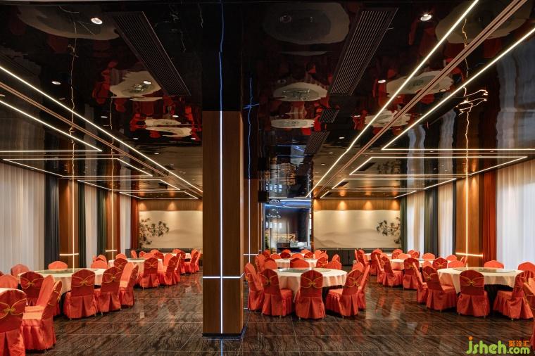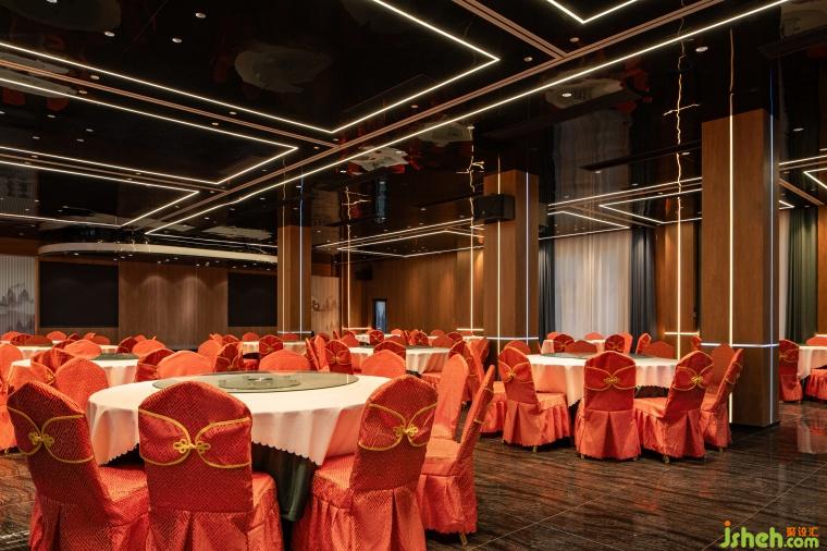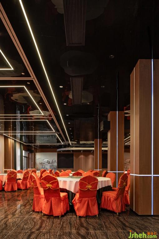 璀璨的燈光如同夜空中閃爍的繁星,灑落在紅色的桌椅和光潔的地面上??臻g以紅色為主色調(diào),輔以原木色,營造出了喜慶而熱烈的氛圍。墻面的水墨畫勾勒出山巒的起伏與揮手相招的迎客松,既有古典氛圍,又展現(xiàn)了對(duì)食客的熱情。
