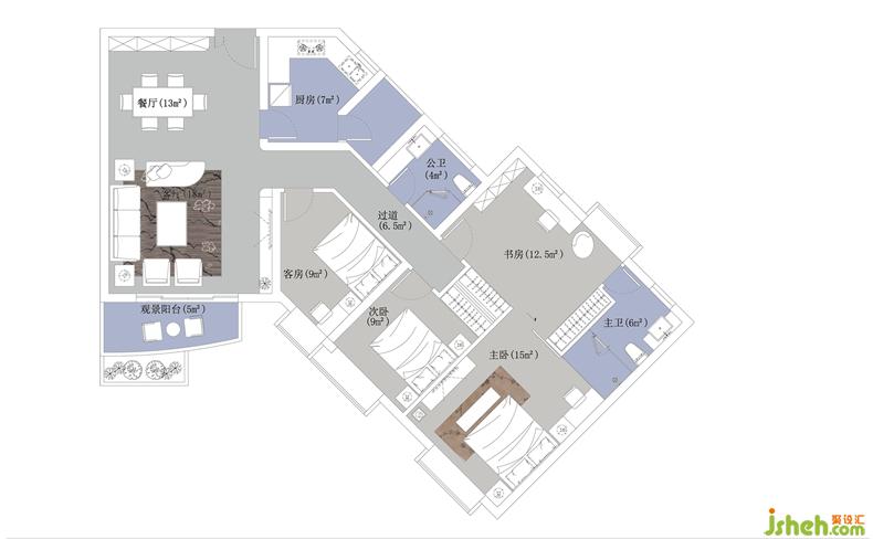 2、主臥和書(shū)房連通做成套房,并在中間設(shè)置推拉門,也可以兩房獨(dú)立,原過(guò)道充分利用,設(shè)置衣帽間衣柜(兩邊用);
