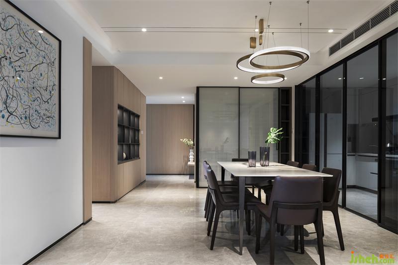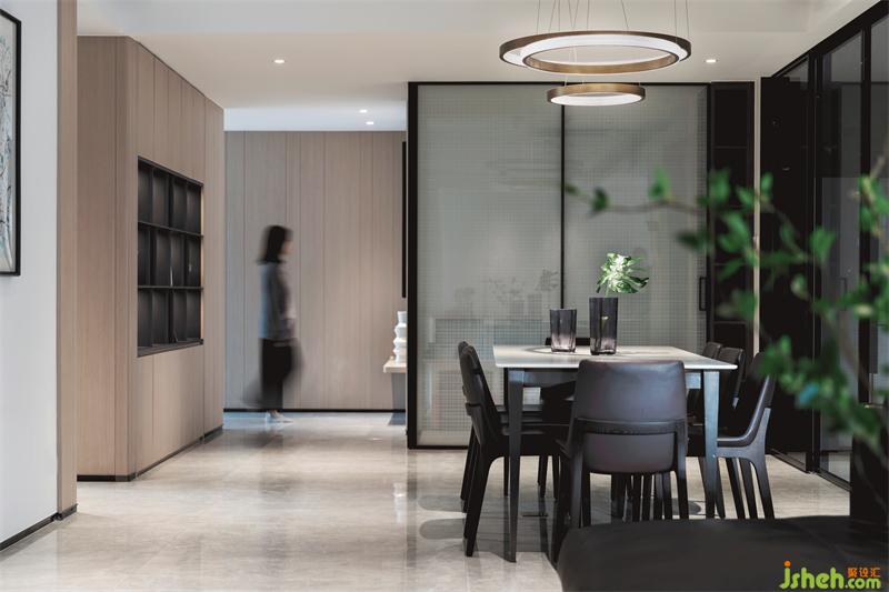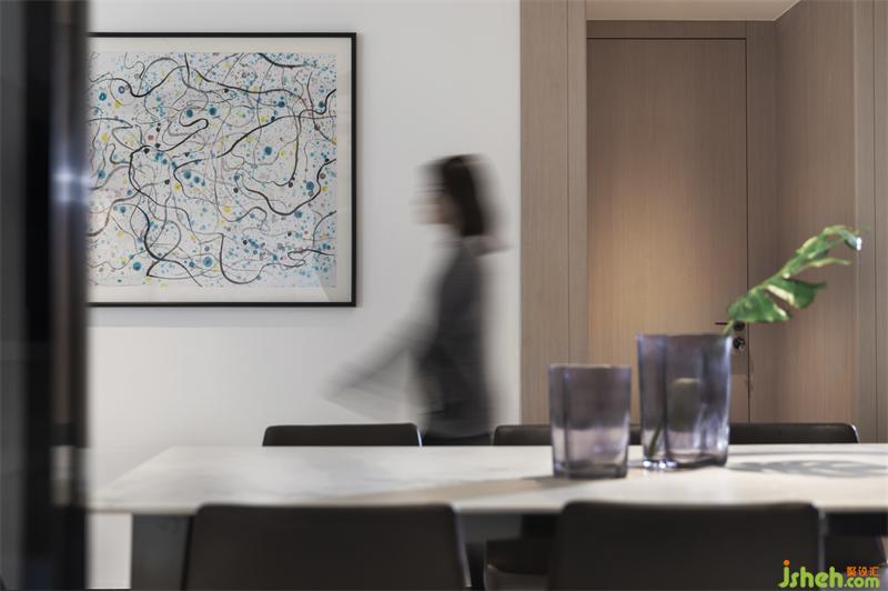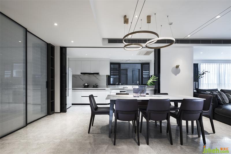 廚房空間與餐廳巧妙融合,四扇暗藏灰波推拉?可以全部隱藏掉,讓廚房立即 變成開放式廚房,并設(shè)置了吧臺增添了生活趣味性,整體極為簡潔優(yōu)雅,無形之中將設(shè)計感融入環(huán)境,成為生活的背景。