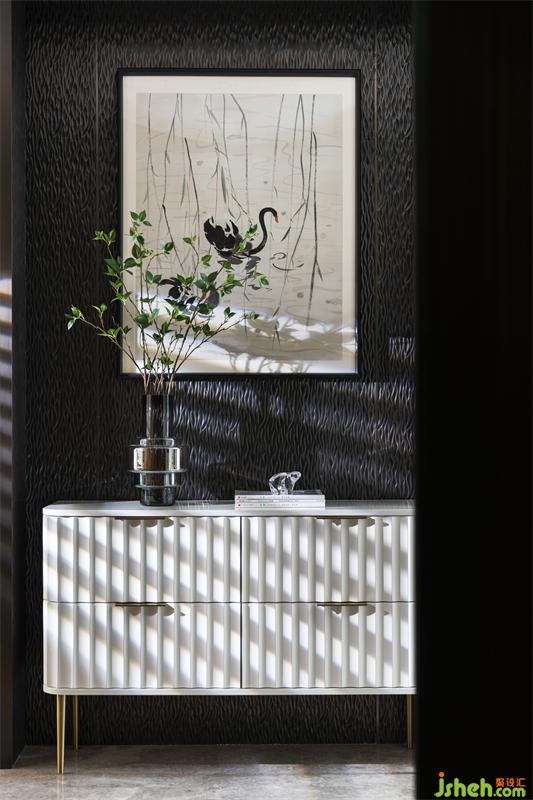 進(jìn)入玄關(guān),我們采用了東方水墨色留白的反差視覺(jué)體驗(yàn),畫中的天鵝在水中高雅的情調(diào),柳條輕盈的垂落下來(lái),與臺(tái)面的花藝虛實(shí)結(jié)合融洽和諧,材質(zhì)特性讓室內(nèi)陽(yáng)光灑入,溫暖流淌。