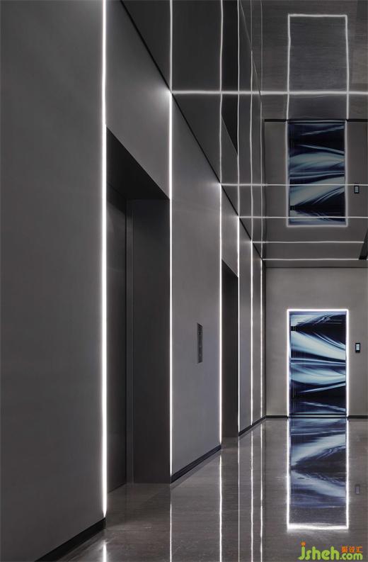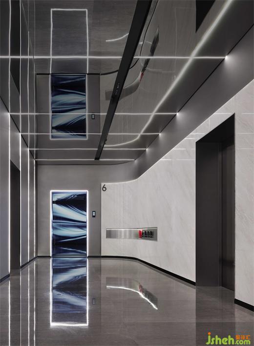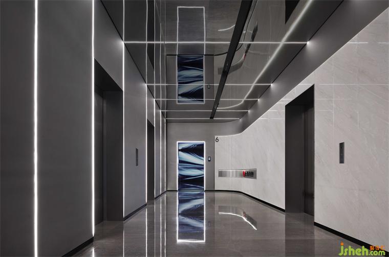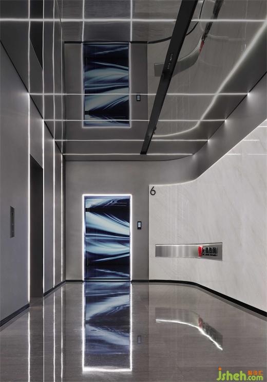 電梯廳通過線性燈條的等比排列、空間色彩明與暗的對比,重點(diǎn)營造未來感和科技感,隱喻傳統(tǒng)裝飾企業(yè),在煥新發(fā)展理念、運(yùn)用新科技的高質(zhì)量發(fā)展道路上的探索和迭變。