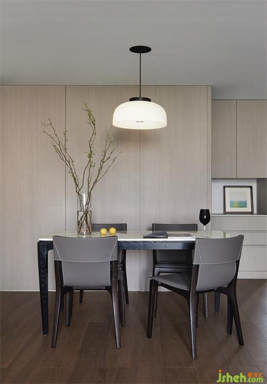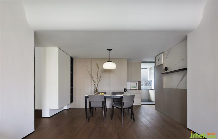 餐廳做了大面積隱形收納柜體,時刻保持整潔有序。餐桌椅用了多年,木頭留下了溫潤的使用痕跡,也適合現(xiàn)在餐廳的風格。