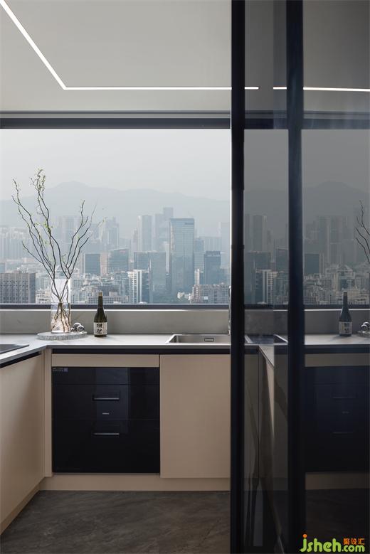 廚房通過移門與客餐廳形成視覺的連通,U型櫥柜布局,貼合洗、切、炒的下廚動線,櫥柜上方采用全景玻璃,做飯也擁有最美的城市景觀。
