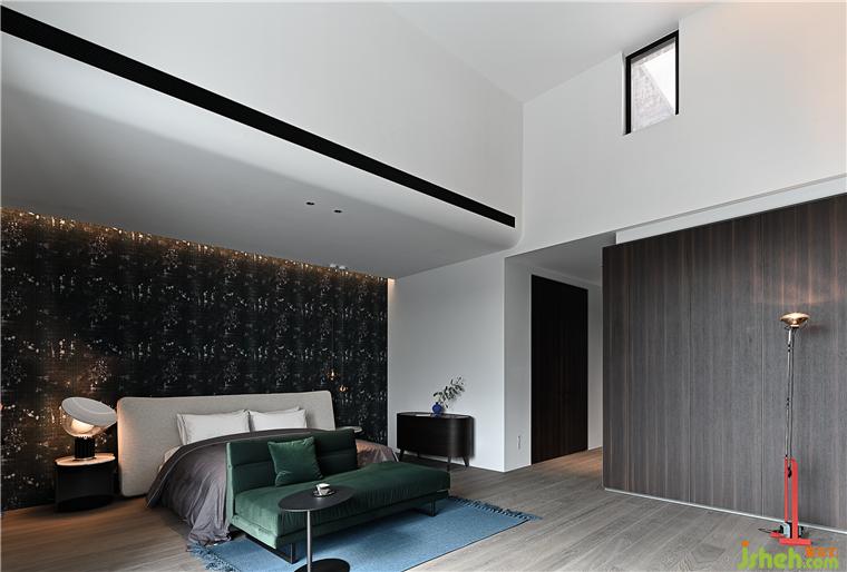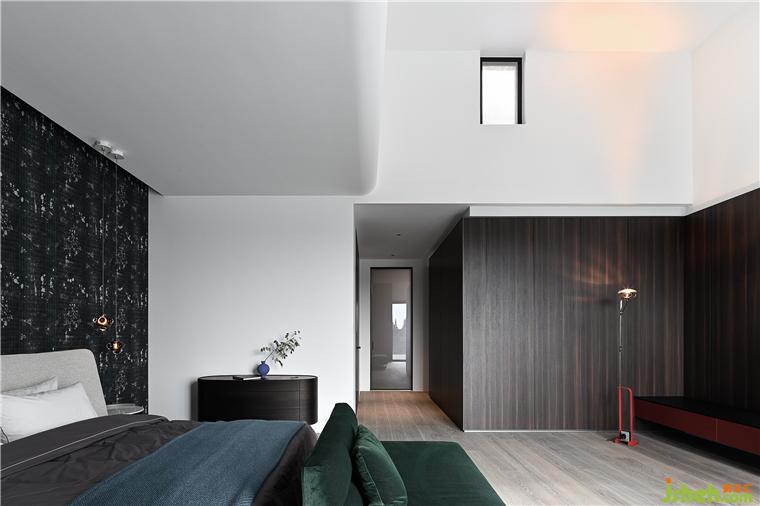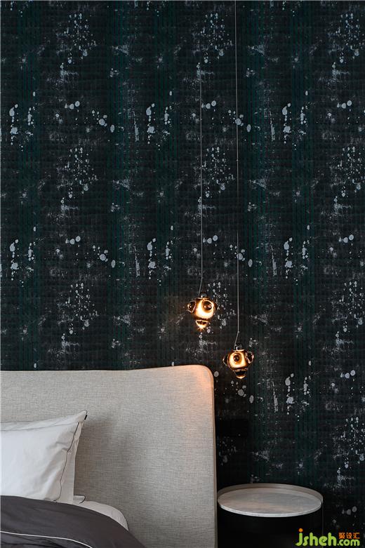 別墅裝修設(shè)計住宅臥室位于二層和三層,低飽和度色調(diào)營造出平靜安逸的情緒空間。房間擁有遼遠(yuǎn)視野與充沛陽光。主臥床后的背景選Wall&decò的做舊紋理墻紙,中間穿插湖綠色的紋路,好像是老建筑遺留下的一堵墻,對空間故事線再次做出提示。