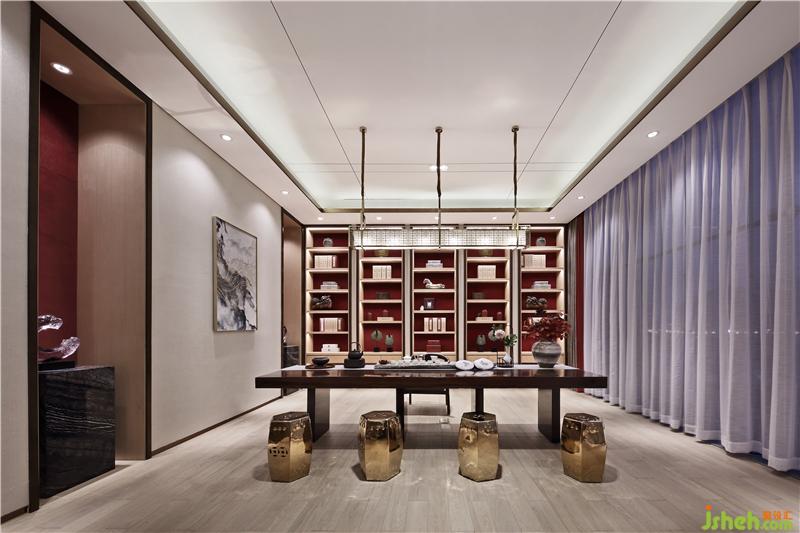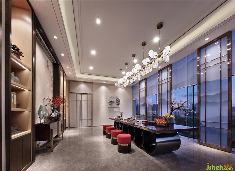 如果說展廳空間是相對硬朗理性的,那在會館的接待室內(nèi),我們更希望它是偏向深諳東方之氣韻,為使用者提供一處寧靜、舒適的體驗場所,于平淡中有驚喜,于回歸中有人性溫暖。淺金色金屬與中式玻璃,傳統(tǒng)中式框架下的柜體與案臺,會所設(shè)計現(xiàn)代中式的色彩與材質(zhì),在VIP品茶室與會晤室體現(xiàn)著有如謙謙君子的厚重與氣質(zhì)。在VIP室等重要區(qū)域的集散地,在整體統(tǒng)一的基調(diào)上,不存在呆滯的文化符號,卻充盈著墨韻馨香的靈動氣息,培養(yǎng)出空間的平衡感和格局觀。會所設(shè)計