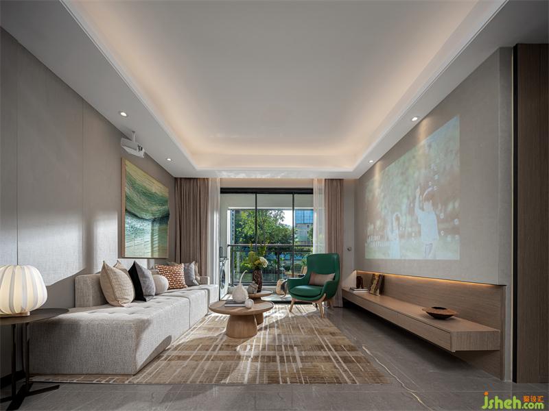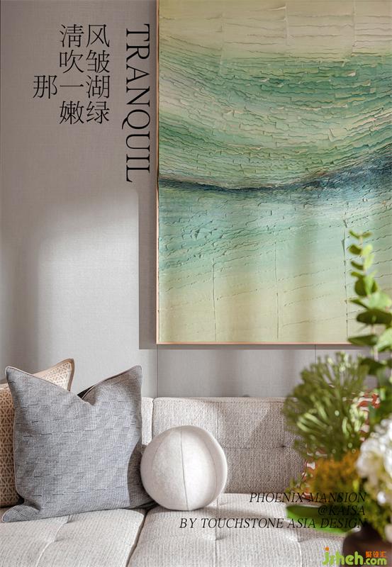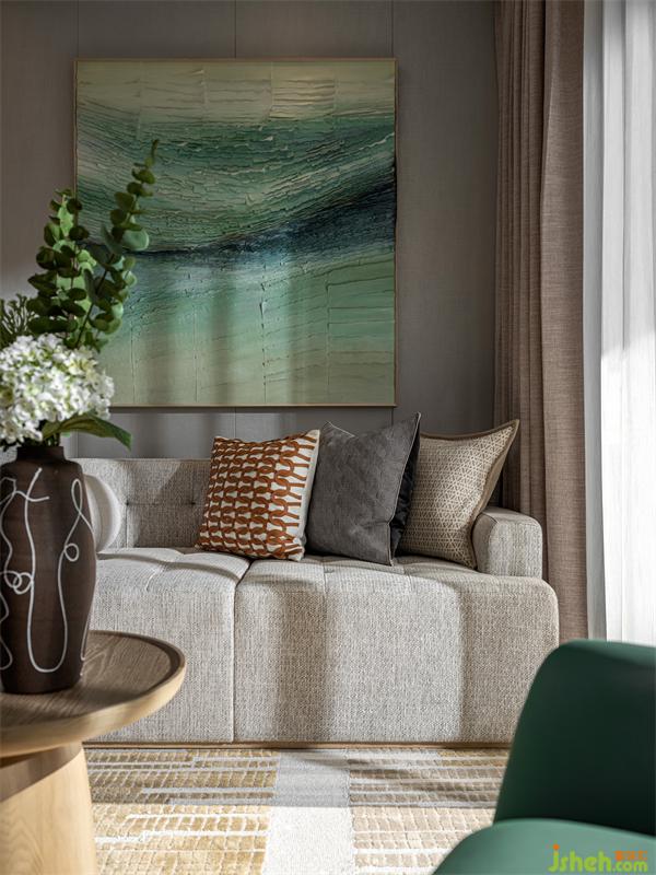 整個(gè)硬裝基底為交付標(biāo)準(zhǔn),在此基礎(chǔ)上,我們著力于慢時(shí)光靜生活的一種氛圍打造,拋開風(fēng)格,我們更多關(guān)注的是每個(gè)物料的質(zhì)感、顏色、形態(tài)帶給我們的情感的變化與渲染。我們選用了淺淡的木色與素綿的亞麻質(zhì)地為基礎(chǔ),搭配嫩綠色融入米黃。沙發(fā)背景的立體裝置掛畫,抽象于如風(fēng)吹皺的湖面,波光漣漣交叉,與對(duì)面墻面的投影相互映照,而茶幾上,正是在湖畔閑看春來秋去的無所思的人兒。