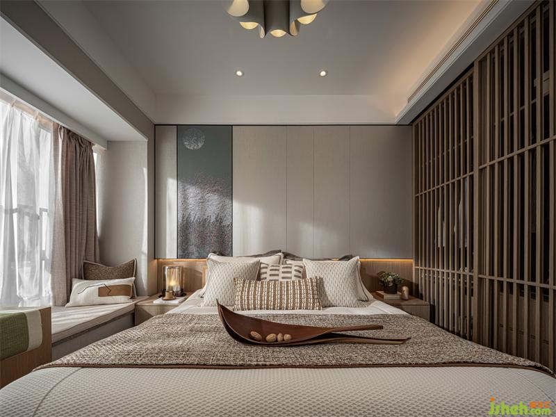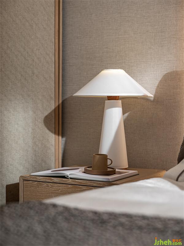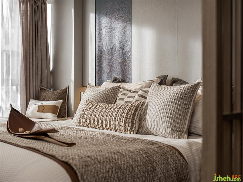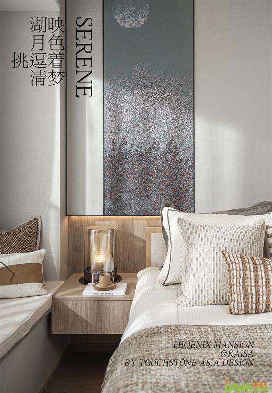 “綠水青山,一輪明月林梢過。石女高歌,古調(diào)無人和?!贝差^背景我們樣板間設(shè)計(jì)了一個(gè)手繪墻布,旨在描繪一種月色撩人的情景:臥室窗外月上樹梢,微風(fēng)輕撫,湖光映照,床前夜品香茗,柔和的燈光與月光融為一體,輕照著歲月輕照著你,漸入微夢。
