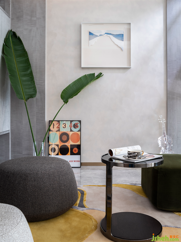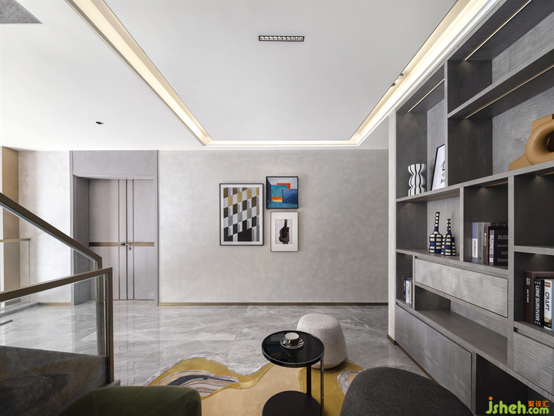 The leisure area is a transitional area between public and private space, and the designer makes full use of it to create a small children's entertainment space. The gray marble of hard outfit and cabinet body, composed lacked a glimmer of life however. Therefore, the soft outfit is given priority to with the color of higher saturation, adding a bit of active color to the space. The irregular carpet, creative ornaments, interesting pillows and changeable hanging pictures make the atmosphere of the whole space relaxed and joyful. At leisure, we can spend precious parent-child time with our children here, making us happy and warm.